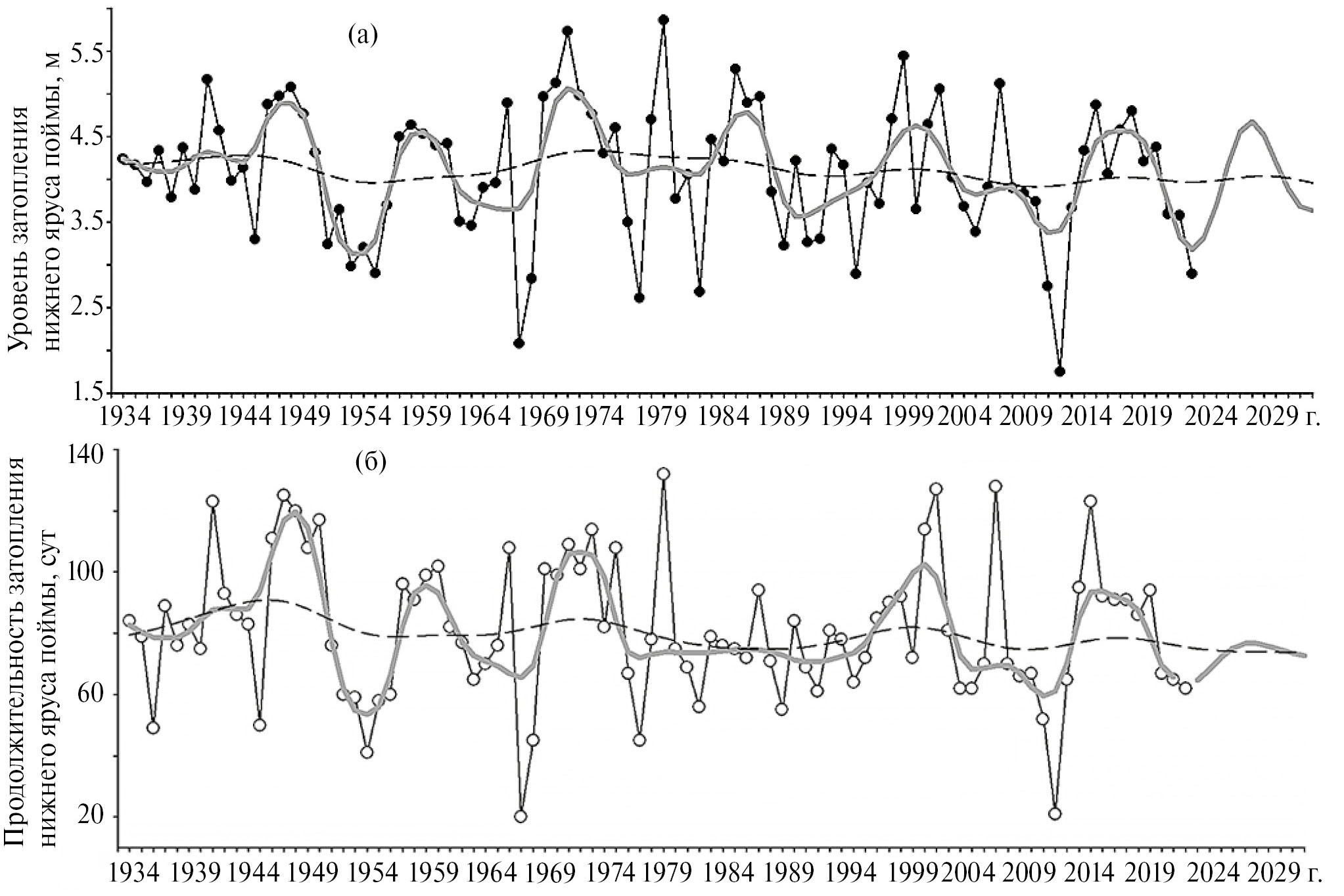 Рис. 3. Гидрология 1934–2023 гг. и прогноз до 2032 г. Многолетняя динамика уровня (а) и продолжительности затопления (б) нижнего экологического яруса поймы в 1934–2023 гг. в Салехардском пойменном районе, ее тренд (штриховая линия: y = 201–0.06*t) и локальное сглаживание (Lowess) – жирная кривая.