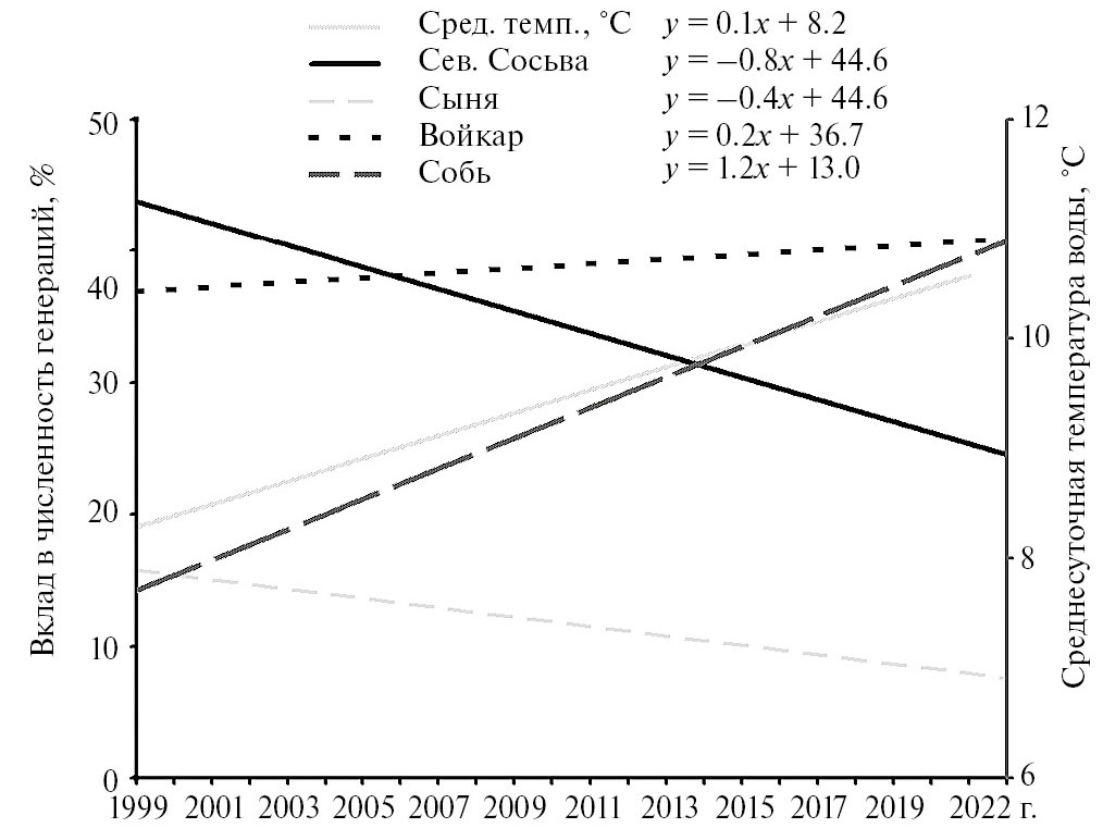 Установлено, что значение р. Северной Сосьвы в воспроизводстве чира, оцененная по численности покатных личинок, составляло в 1980-е гг. 43%, в последующие десятилетия постепенно снижалось до 31 % и достигло в 2021–2023 гг. 13%. Значение р. Сыни также за эти годы снижалось с 20% до 4%. Ведущая роль в воспроизводстве обского чира за период с 1981 г. по 2009 г. неизменно принадлежала р. Северной Сосьве. Затем основными нерестовыми реками чира стали более северные притоки Войкар и Собь – в последние три года их вклад в воспроизводство составил 68% (рис. 5) против 38% в 1980-е гг. Увеличение значения северных притоков могло произойти в связи с изменением температурного режима вод Оби. Средняя температура воды в период хода чира по руслу Оби в августе–октябре за последние 25 лет увеличилась, поэтому чир, как холодолюбивый вид, в большей мере выбирает более северные притоки для нереста (см. рис. 5). Косвенно такое развитие событий подтверждает и увеличение уровня воспроизводства налима (холодолюбивый вид) в северных уральских притоках [23]. Увеличение значения р. Соби в воспроизводстве чира возможно также связано с появлением нового кормового водоема в нижнем течении реки после разработки месторождений ПГС в 1990-е гг. Снижение значения р. Северной Сосьвы, вероятно, связано с усилением нагрузки промысла (включая браконьерство и вылов для рыбоводных целей, который увеличился за последние три года в два раза) при более длительной миграции. Так, от устья р. Войкар до нерестилищ в бассейне р. Ляпин производителям нужно пройти еще более 700 км, минуя десятки населенных пунктов.