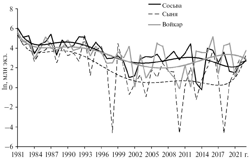 Отмечена высокая синхронность динамики численности покатных личинок чира на уральских нерестовых притоках (рис. 6), что свидетельствует об относительной стабильности условий инкубации икры. Лишь в отдельные годы из-за локальных заморов на р. Сыне (1998, 2010, 2018 гг.) синхронность динамики нарушается.