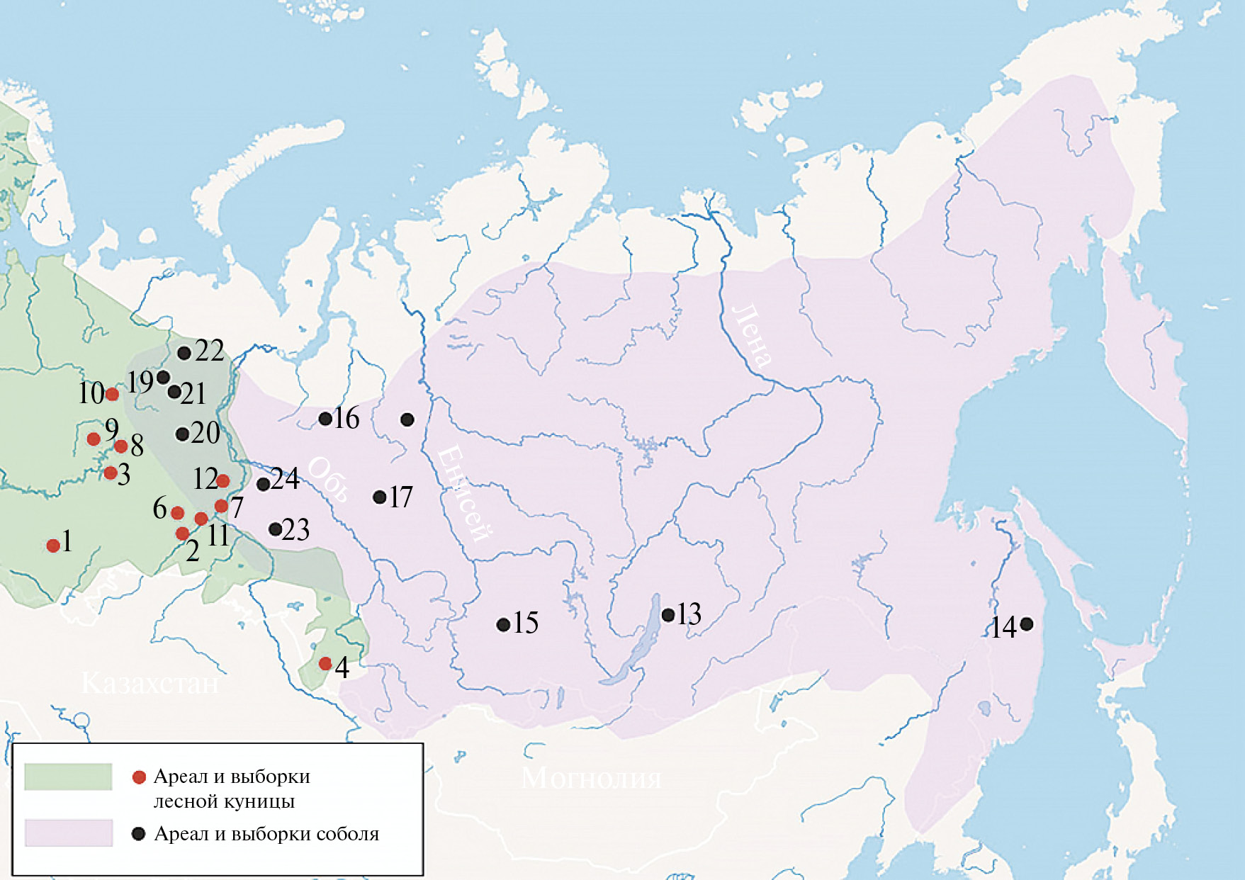 Рис. 1. Происхождение изученных выборок лесной куницы и соболя (схема – по: https://www.iucnredlist.org/). Номера выборок указаны в табл. 1 и 2.