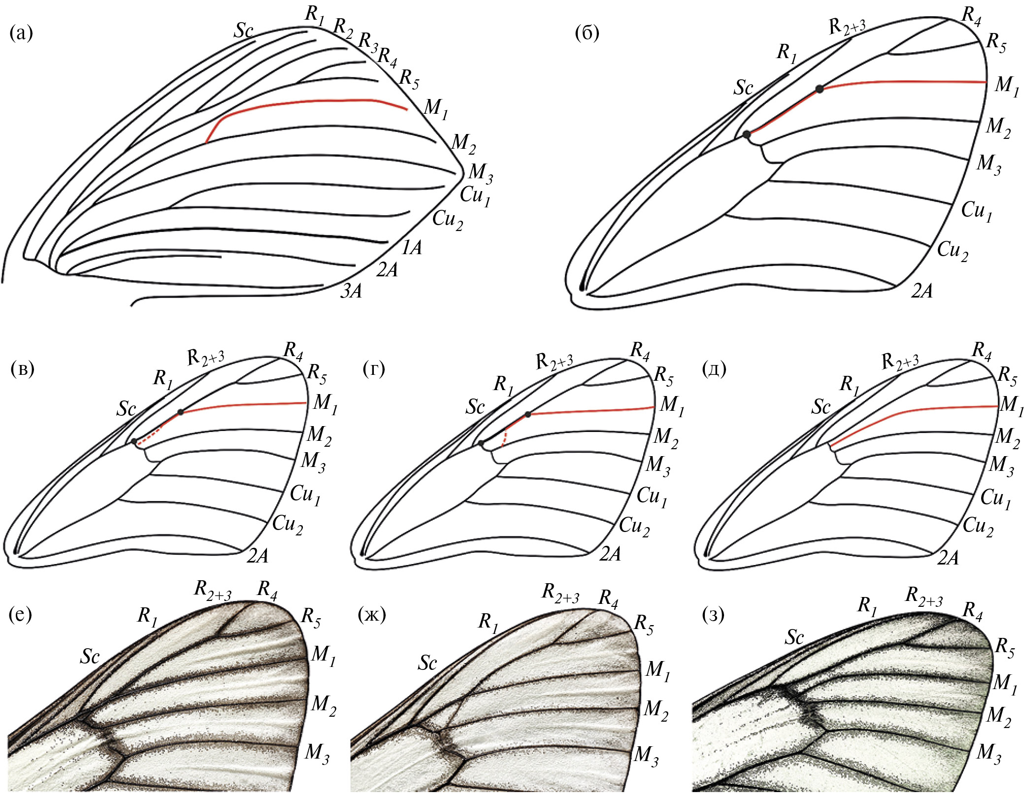 Рис. 3. Нарушения жилкования крыльев боярышницы, связанные с неполным срастанием медиальной жилки М1 и радиальной R(4+5) (тип V): а – жилкование крыльев белянок на стадии куколки [61]: жилка M1 (выделена красным) не срощена с жилкой R(4+5) и отходит от медиального ствола; б – нормальное жилкование имаго боярышницы: жилки M1 и R(4+5) образуют единую жилку M1+R(4+5) (ее границы обозначены черными точками); в–д – схематичные изображения нарушений жилкования, связанных с неполным срастанием жилок M1 и R(4+5); е–з – примеры соответствующих нарушений жилкования.