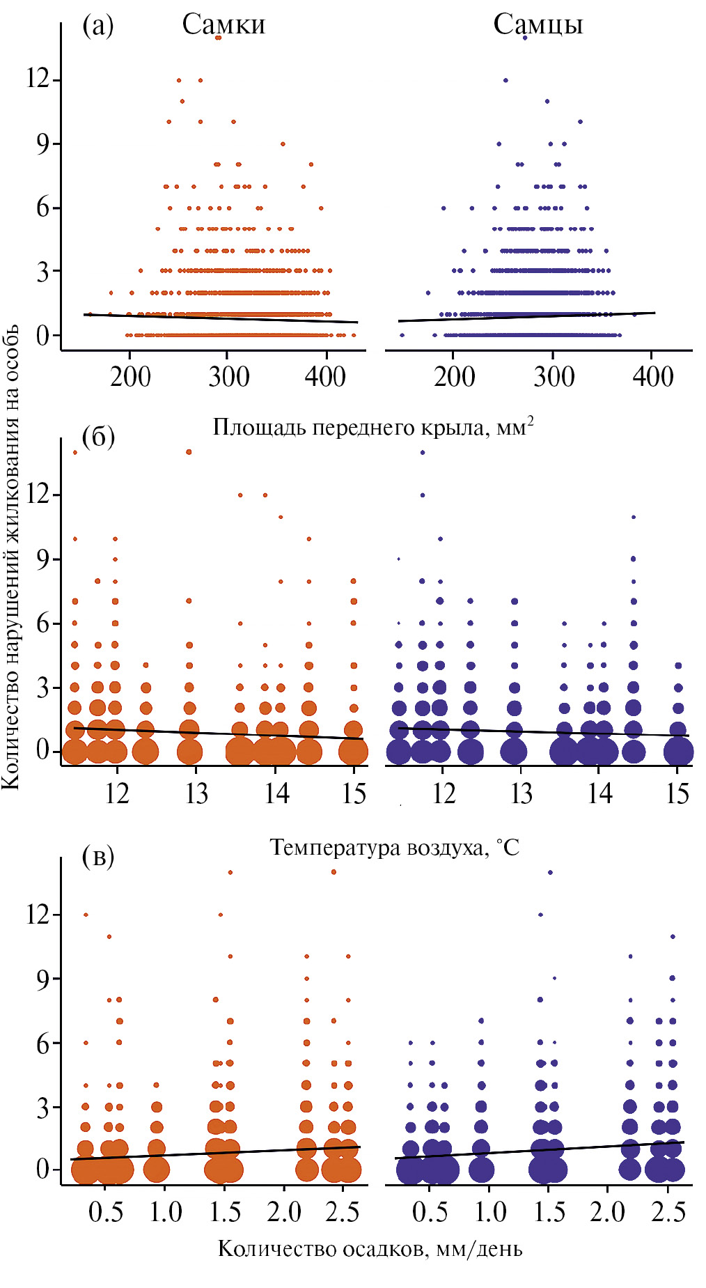 Суммарная встречаемость всех нарушений жилкования статистически значимо зависит как от погодных условий (температуры воздуха и количества осадков) во время развития преимагинальных стадий весной, так и от площади переднего крыла (табл. 2). Отклонения от нормального жилкования чаще встречаются у самок с мелкими крыльями, у самцов эта закономерность отсутствует (см. табл. 2 и рис. 4а). Нарушения встречаются чаще в годы с холодной весной (эта закономерность значима только у самок, а у самцов присутствует в виде статистически незначимой тенденции) и с бо́льшим количеством осадков (рис. 4б, в).