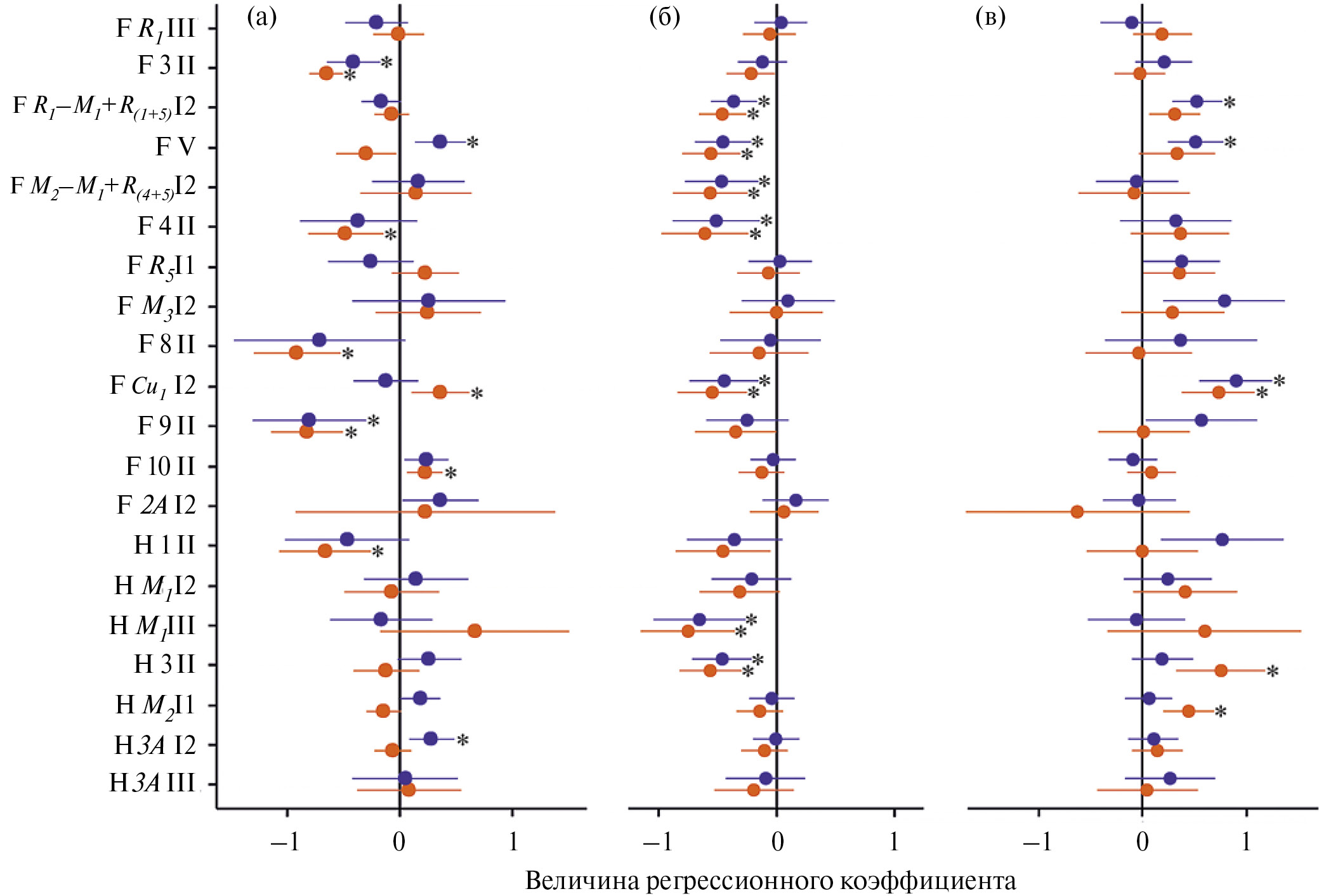 Рис. 5. Регрессионные коэффициенты (± 95%-ные доверительные интервалы), характеризующие влияние площади переднего крыла (а), температуры воздуха (б) и количества осадков (в) во время постдиапаузного развития боярышницы на встречаемость отдельных вариантов нарушений жилкования крыльев. Названия вариантов нарушений жилкования: F – переднее крыло, H – заднее; номера ячеек и названия жилок приведены в соответствии с рис. 1. Римскими цифрами (I–V) обозначен тип нарушения жилкования, арабскими (1–3) – подтип. Самцы обозначены синим, самки – красным; * – регрессионные коэффициенты значимо (p < 0.05) отличаются от нуля с учетом поправки Бенджамина–Хохберга.