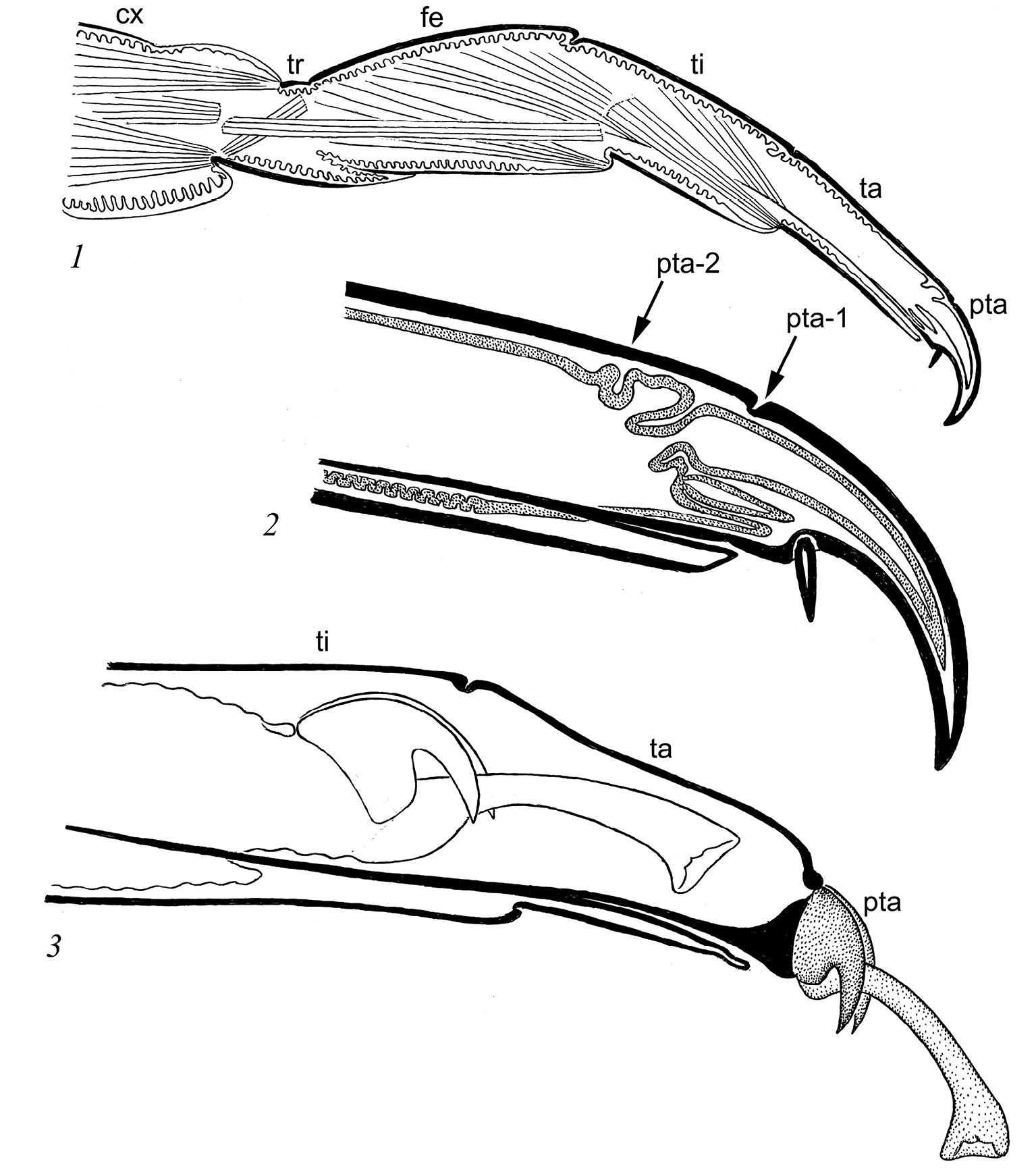 cx – тазик, fe – бедро, pta – коготок (претарсус), pta-1 – старое место причленения коготка, pta-2 – новое место причленения коготка, ta – лапка, ti – голень, tr – вертлуг.