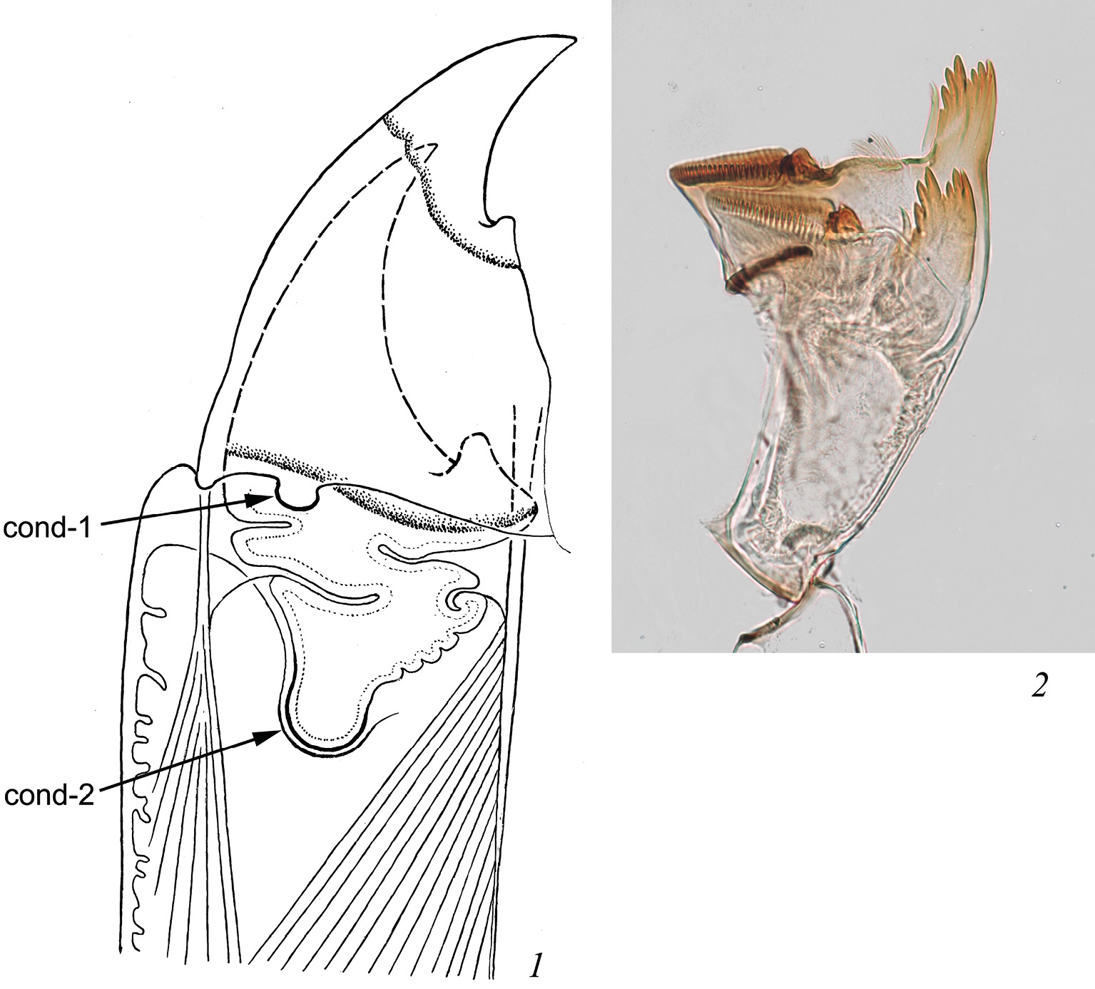 1 – край головной капсулы и мандибула личинки ручейника Rhyacophila nubila Zetterstedt, 1840; 2 – мандибула поденки Cheleocloeon clavifolium Kluge, 2016.