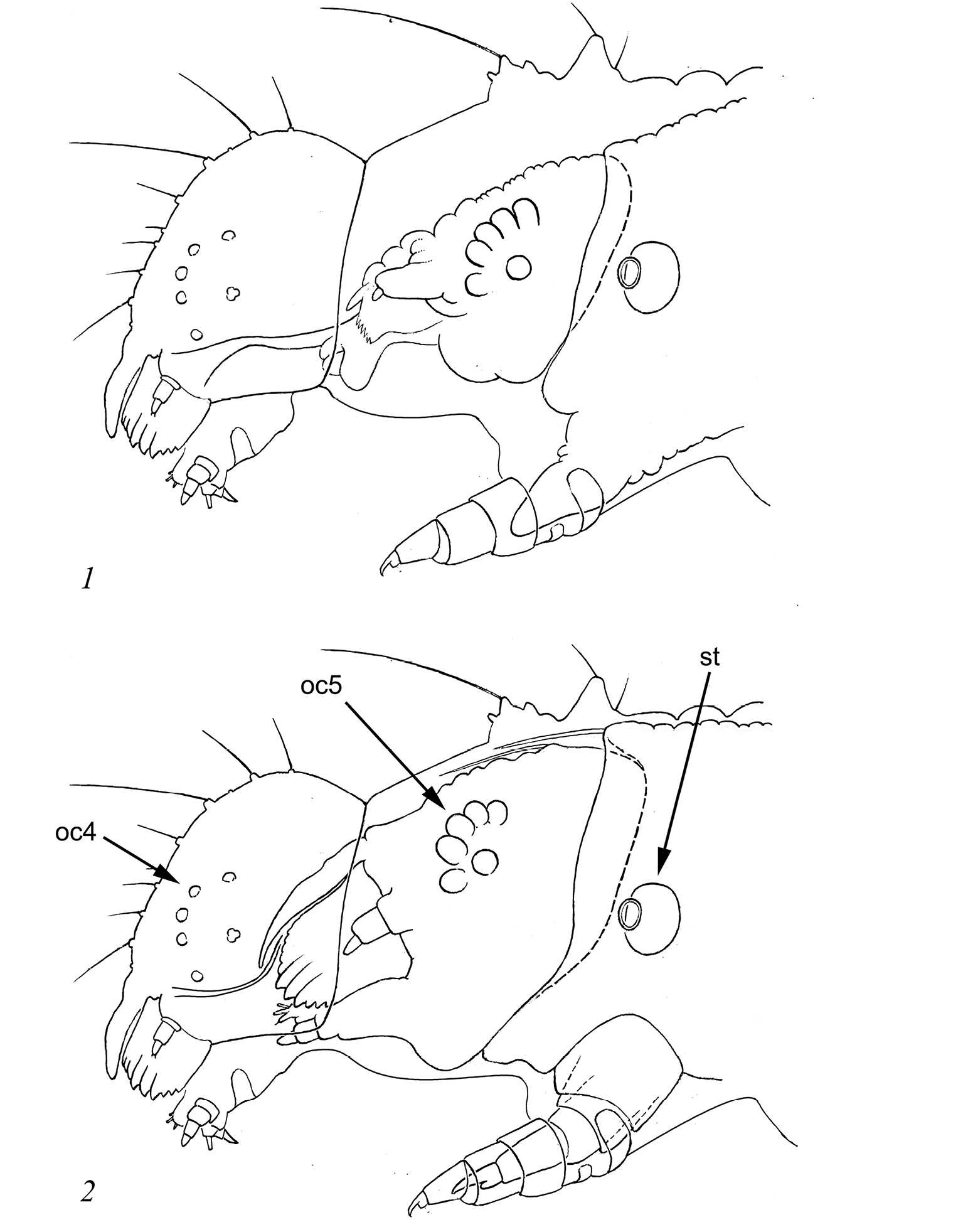 oc4 – шесть кутикулярных линз личинки IV возраста; oc5 – шесть омматидиев личинки V возраста; st – выросшее дыхальце (крупный овал) под старой кутикулой дыхальца (меньший овал).