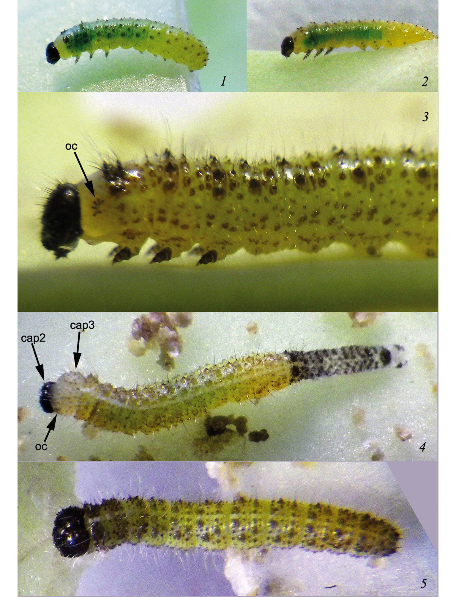 1, 2 – гусеница I возраста перед линькой на II возраст ((1 – глаза еще скрыты кутикулой головной капсулы, 2 – через 1.5 часа (глаза видны позади головной капсулы)); 3 – гусеница III возраста перед линькой на IV возраст; 4 – линька гусеницы II возраста на III возраст; 5 – такая же гусеница III возраста после пигментации кутикулы.