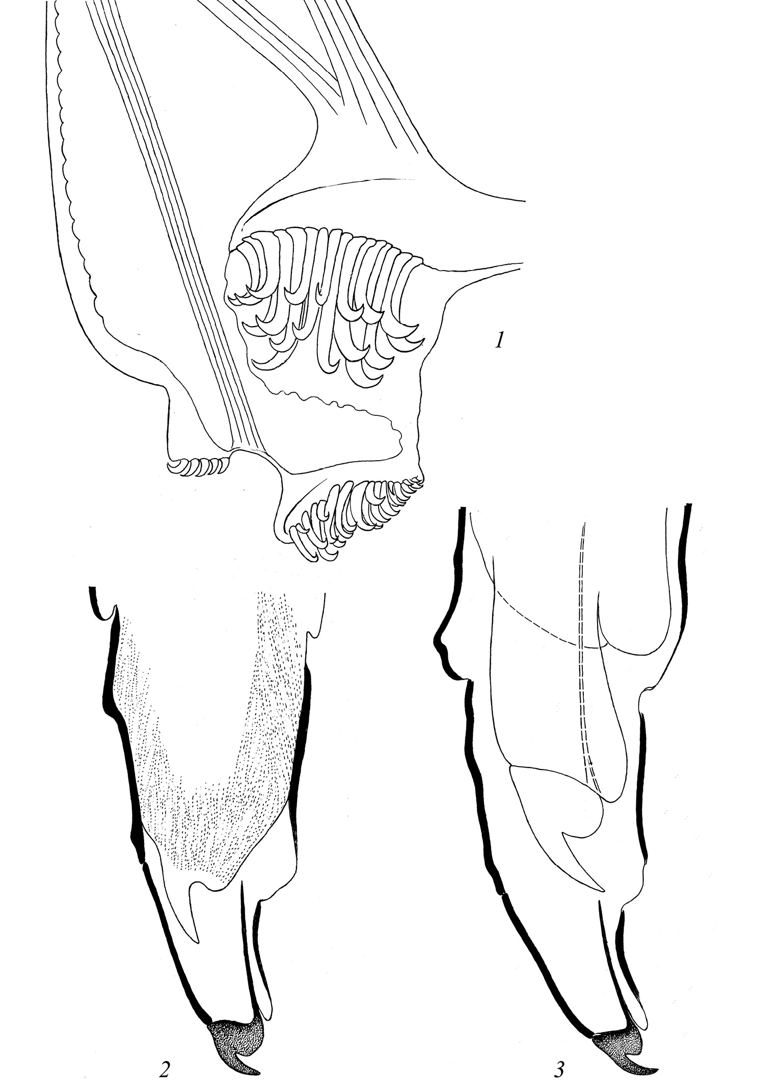 1 – нога личинки ручейника Rhyacophila nubila Zetterstedt, 1840; 2 – то же, увеличенные вершина лапки и коготок (старая кутикула черная, новая кутикула пунктирована); 3 – вершина лапки и коготок личинки златоглазки Chrysotropia ciliata (Wesmael, 1841).