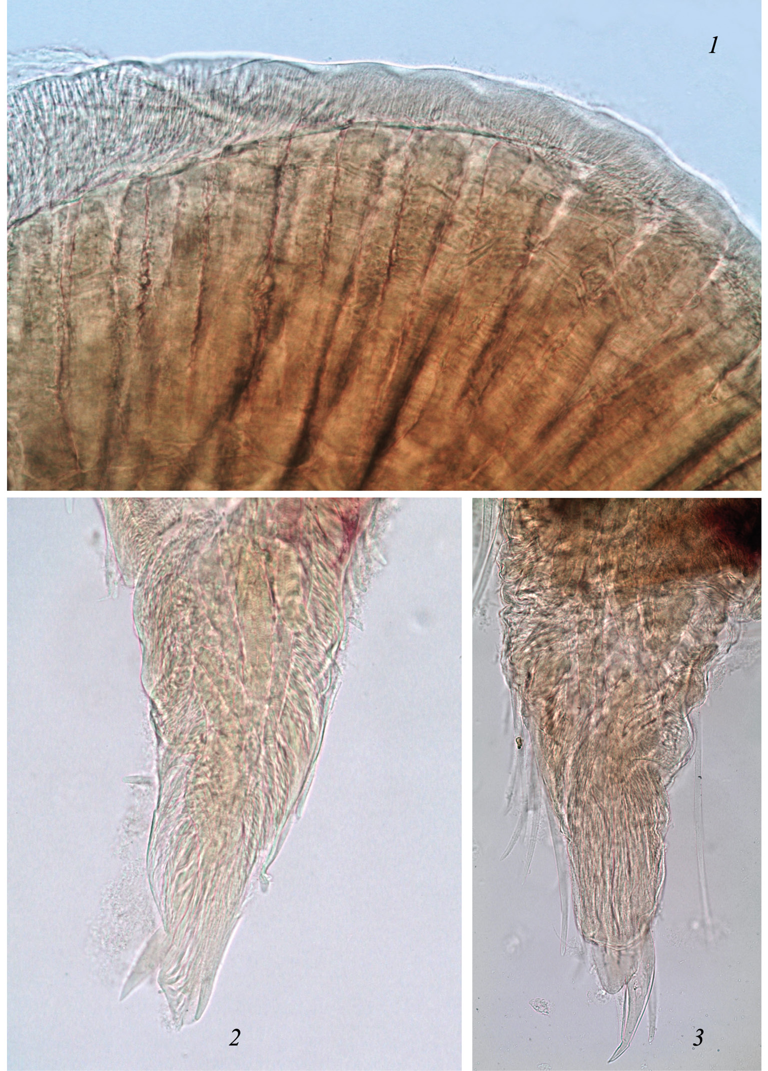 1 – Manduca sexta (L.): фрагмент головы, извлеченный из-под старой кутикулы груди (видны округленные концы мышц, примыкающие к столбчатому покровному эпителию); 2, 3 – Pieris brassicae (L.): уменьшившиеся ноги, извлеченные из-под старой кутикулы ног.