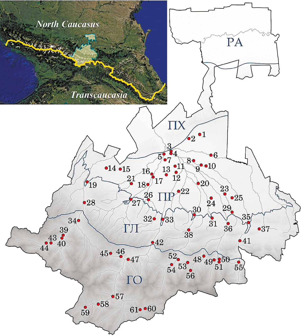 Рис. 1. Пункты сборов материала на территории Республики Северная Осетия — Алания (обозначения в тексте)