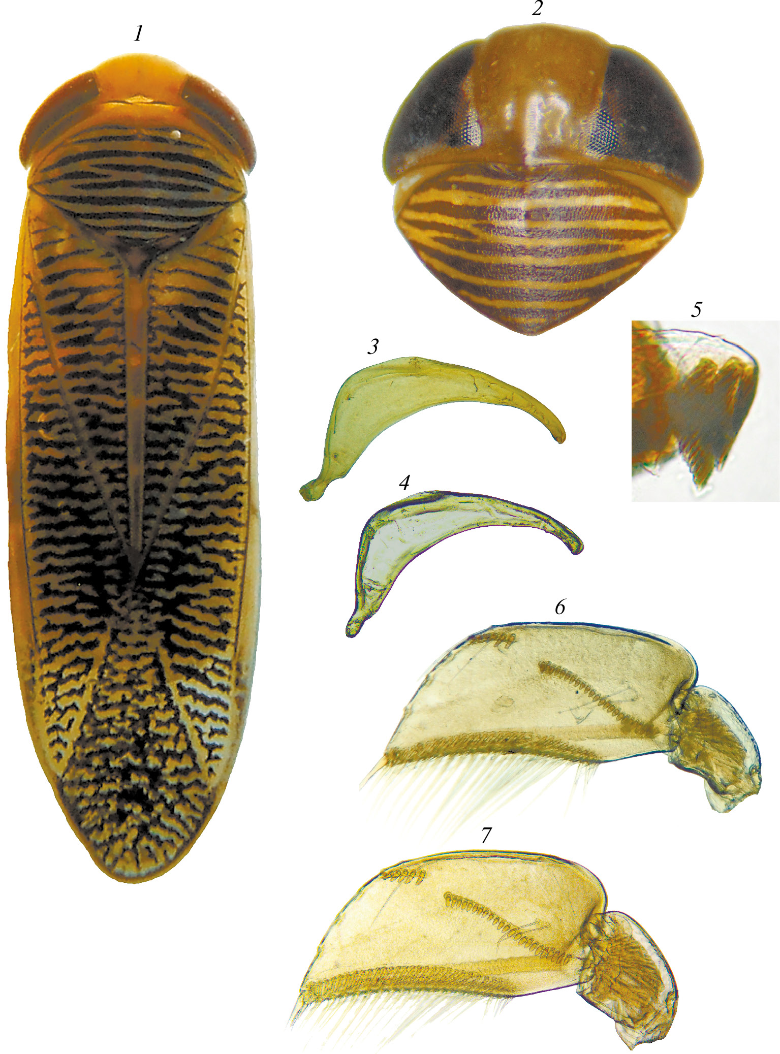 Рис. 3. Sigara daghestanica Jansson, самка, имаго (общий вид (1), голова и переднеспинка сверху (2)) и самец (правый парамер (3, 4), стригил (5) и передняя лапка (6, 7)) (Северная Осетия)