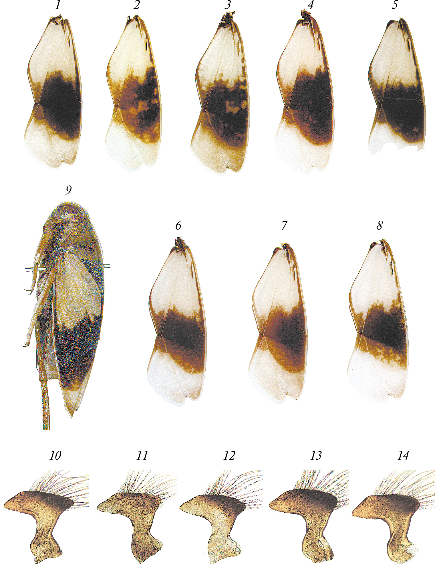1‒12 ‒ Notonecta glauca poissoni Hungerford (1‒8 ‒ изменчивость окраски надкрылий, 9 ‒ общий вид имаго сбоку, 10‒12 ‒ парамер); 13, 14 ‒ N. glauca glauca L., парамер
