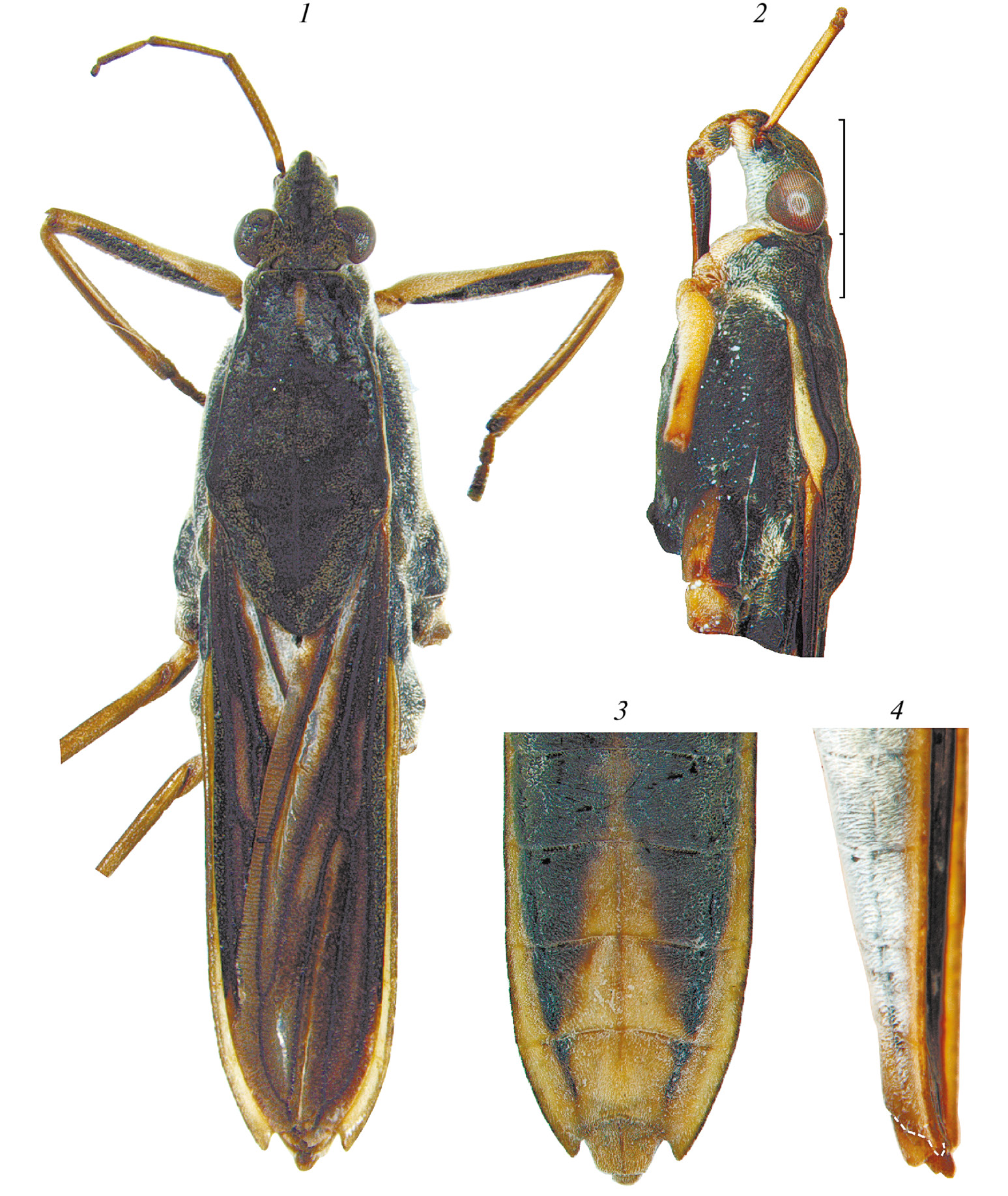 1 – общий вид сверху; 2 – голова и переднеспинка сбоку; 3 – вершина брюшка снизу; 4 – то же, сбоку