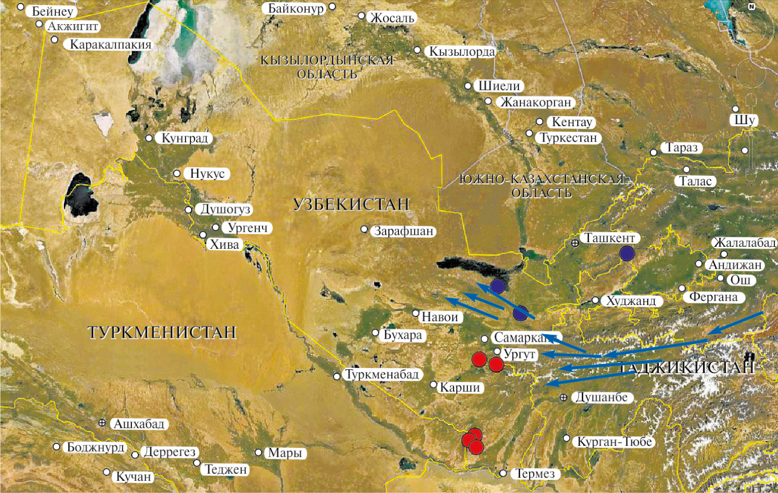 Красный кружок — G. costae fieberi Stichel; синий кружок — G. costae sahlbergi Distant. Синими стрелками обозначены хребты: слева — Каратау, Актау и Нуратау, в центре — Гиссарский, Зеравшанский и Туркестанский, справа — Алайский