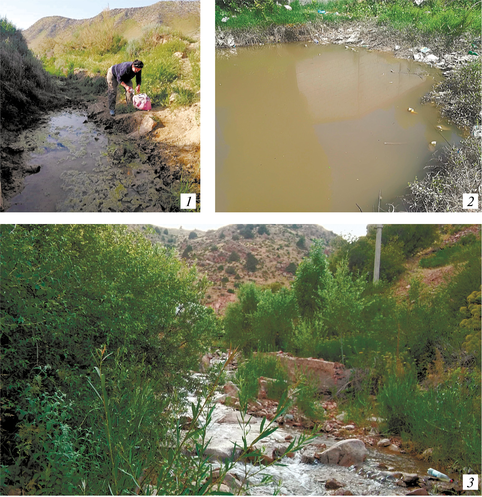 1 – небольшое углубление в пересыхающей канаве между оз. Тузкан и скалами (40°33ʹ34.42ʺ N, 67°22ʹ10.7ʺ E, 245 ± 15 м над ур. м., температура воды — 16 °С), 28.IV.2023; 2 – хауз около автодороги, равнина, Шараф-Рашидовский р-н, Джизакская обл. (40°4ʹ23.28ʺ N, 67°54ʹ12.28ʺ E, 368 ± 13 м над ур. м., температура воды — 18 °С), 29.V.2022; 3 – горный сай в узком ущелье, кишлак Резак, Наманганская обл. (41°03ʹ38.84ʺ N, 70о33ʹ40.85ʺ E, 2039 м над ур. м., температура воды — 14 °С), 17.VI.2023. Фото Н. И. Лебедевой