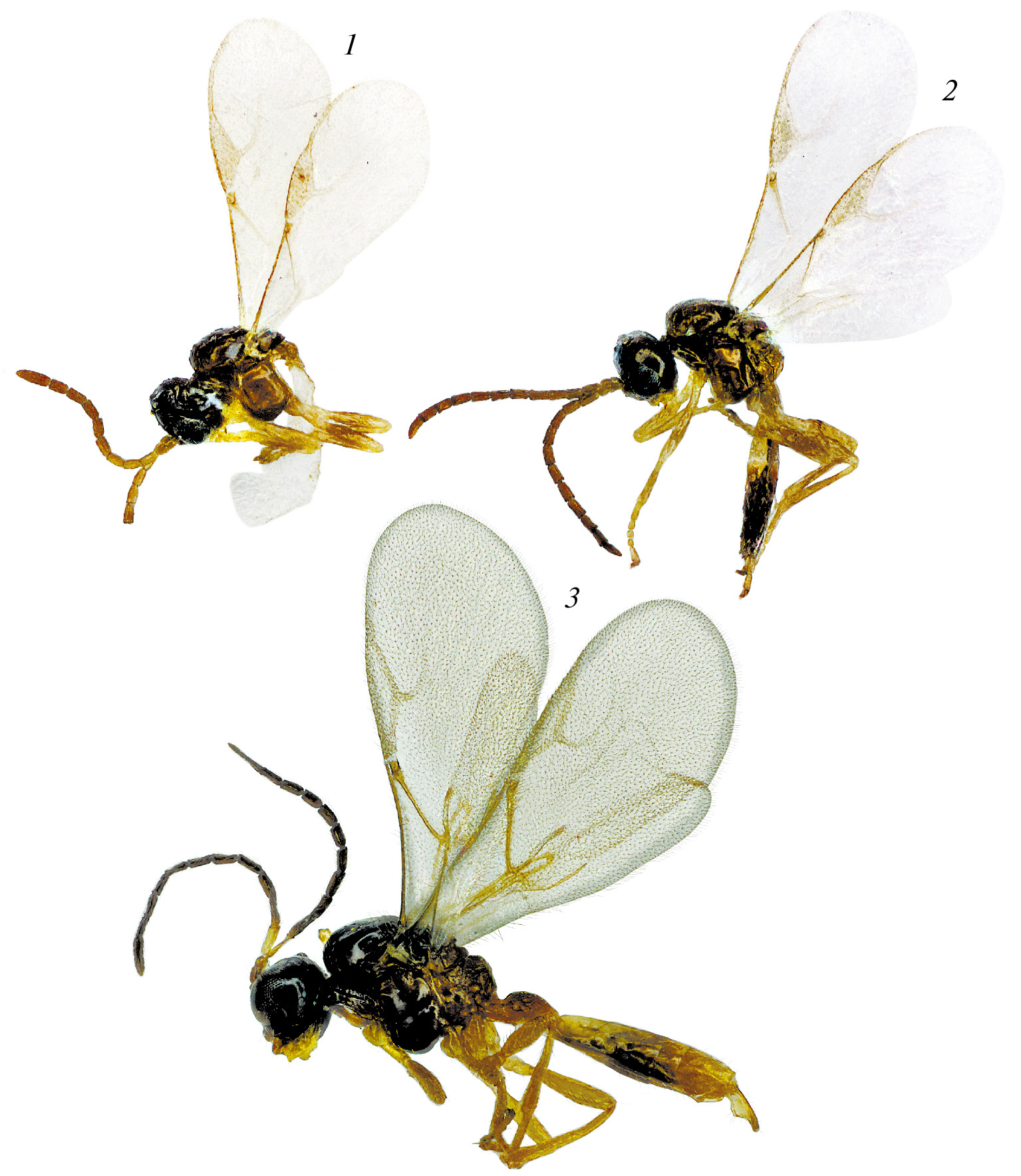 Рис. 1. Diaeretellus tremulae sp. n. (1, 2) и Monoctonus sambuci sp. n. (3), общий вид (1 – голова и грудь без проподеума), голотип (1, 3) и паратип, самец (2)
