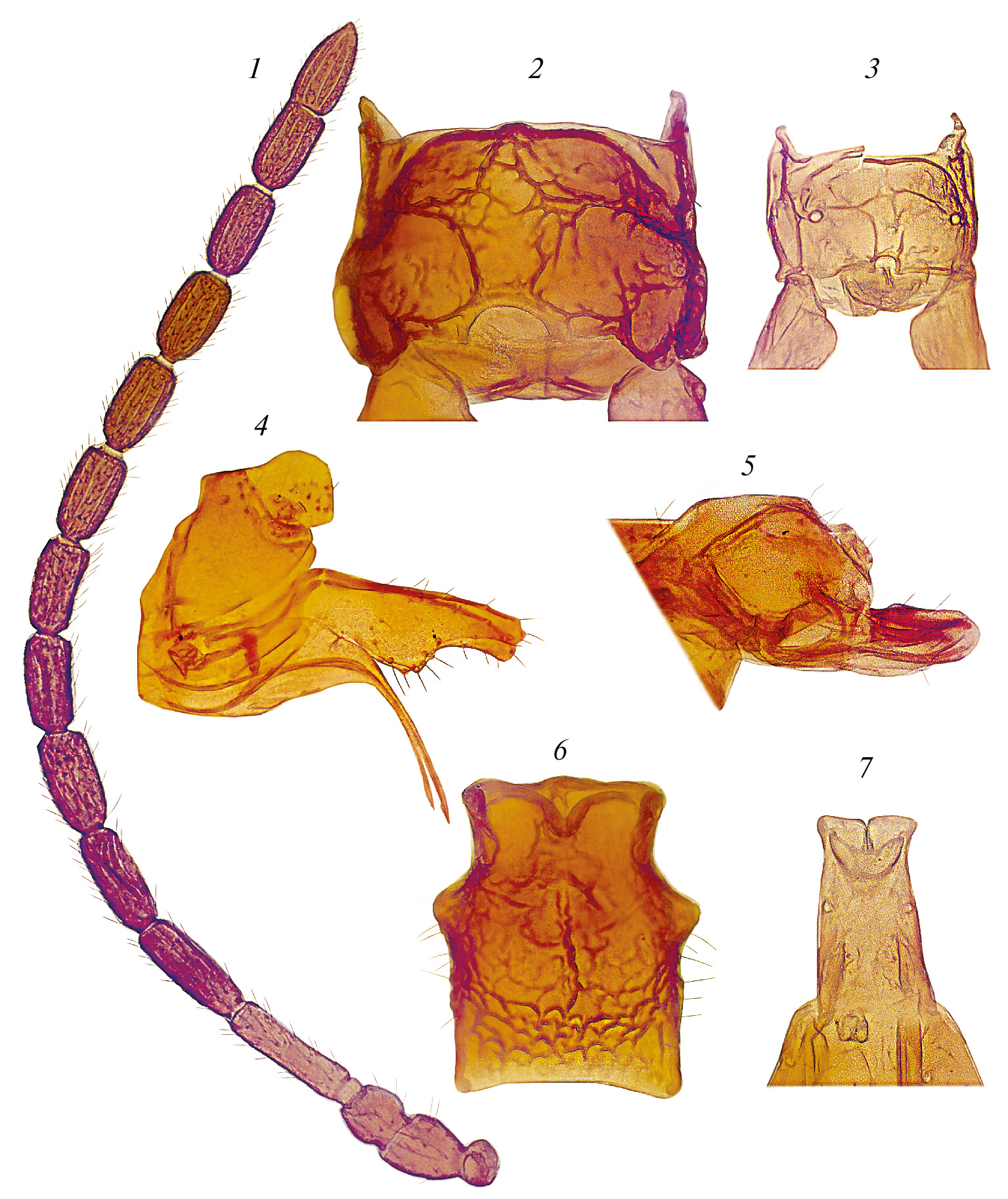 Рис. 2. Monoctonus sambuci sp. n. (1, 2, 4, 6) и Diaeretellus tremulae sp. n. (3, 5, 7), детали строения