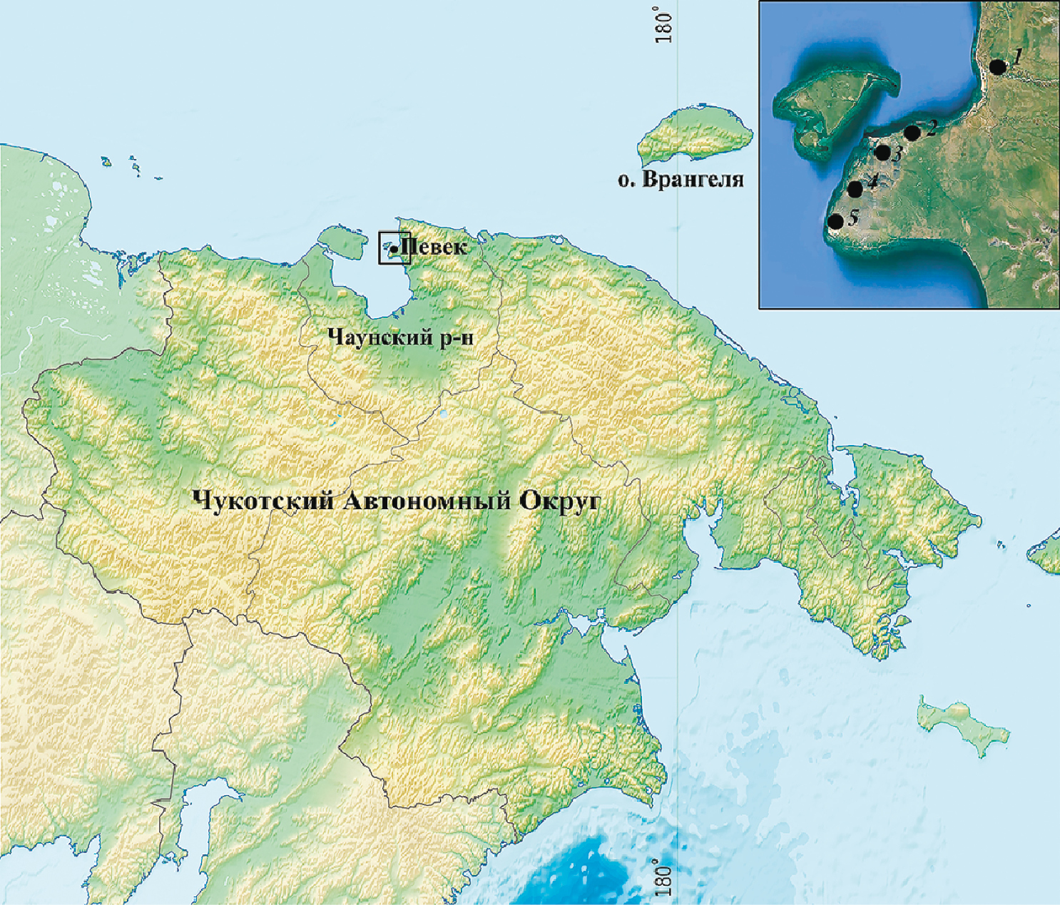 Рис. 1. Места проведения работ в окрестностях г. Певек. 1 — нижнее течение р. Апапельгын, 2 — окр. сопки Янрапаакэнай, 3 — северная часть сопки Пээкиней, 4 — южная часть сопки Пээкиней, 5 — окр. пос. Валькумей.