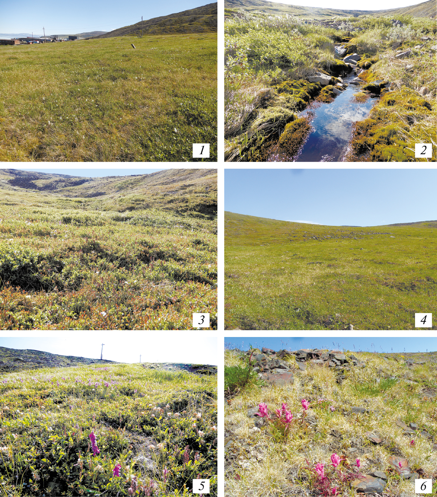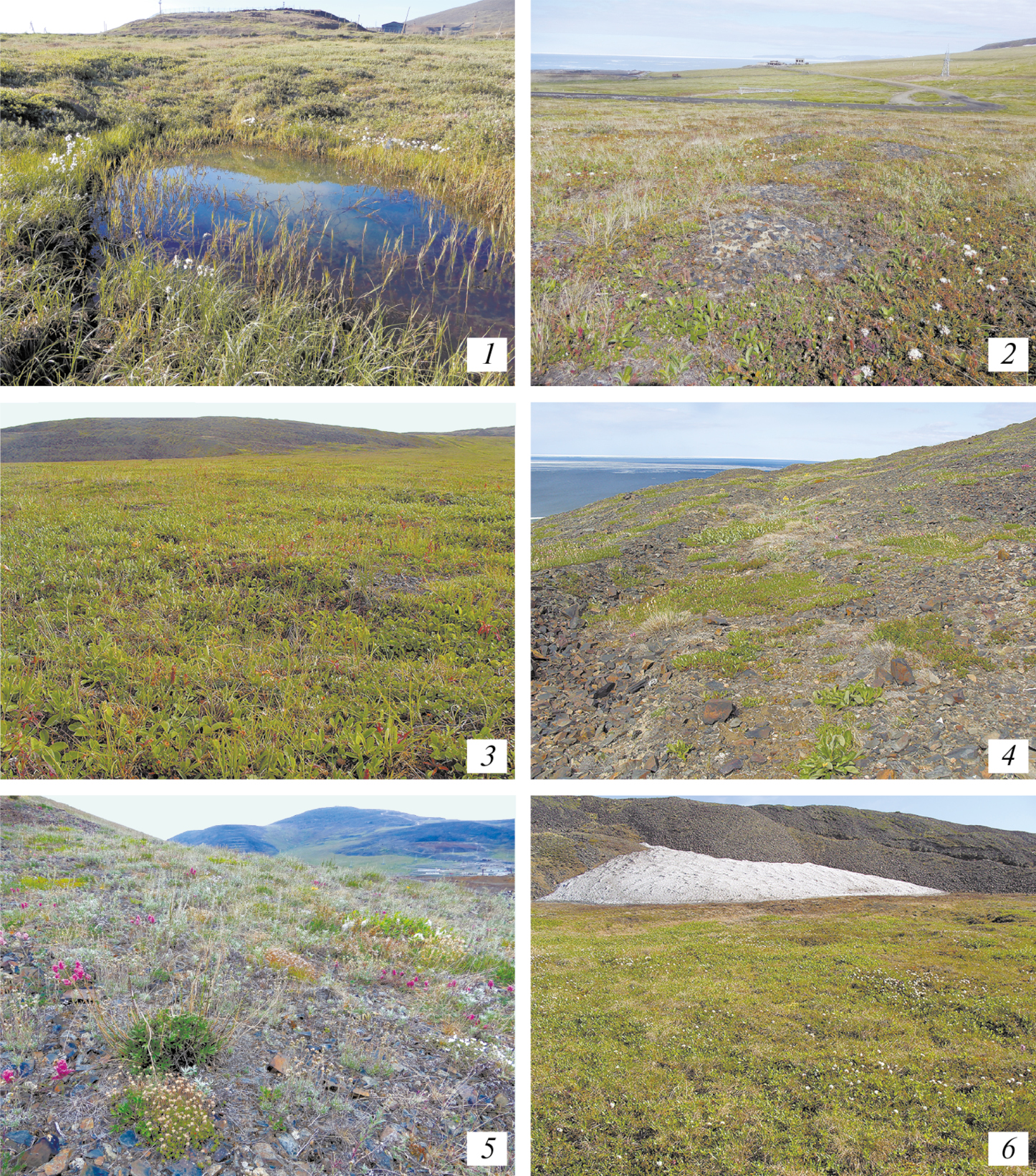 Рис. 2. Фотографии местообитаний в окрестностях сопки Янрапаакэнай. 1 — глубокая лужа на предгорном шлейфе, 2 — предгорный шлейф с пятнистым травяно-кустарничковым покровом, 3 — полидоминантная кустарничковая тундра на предгорном шлейфе, 4 — щебнистый склон южной экспозиции с пятнистым разнотравно-дриадовым покровом, 5 — сухая разнотравно-злаковая луговина на крутом склоне южной экспозиции, 6 — кустарничково-травяно-моховая сырая тундра на нагорной террасе под снежником.