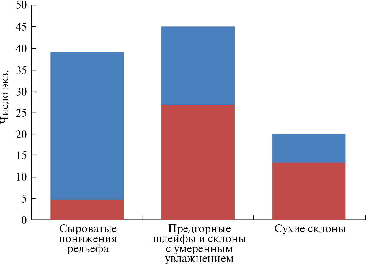 Рис. 4. Численность типулид с разными типами широтного простирания ареалов в местообитаниях горной части в окр. Певека. Красным цветом обозначены виды с гипоаркто-монтанными ареалами, синим — с арктическими/аркто-монтанными ареалами.