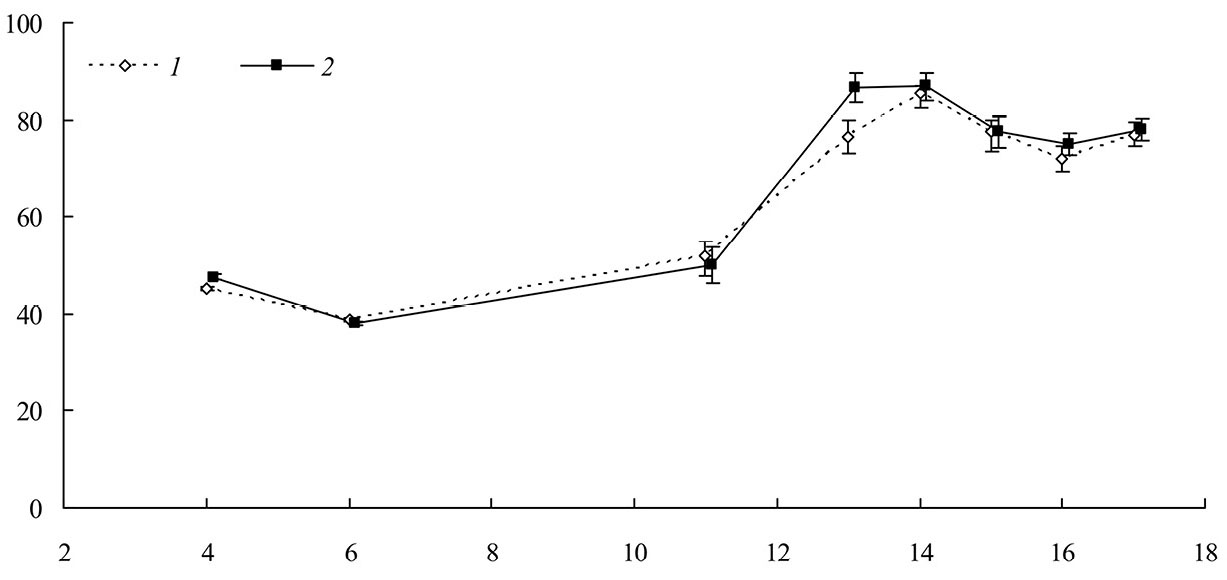 Рис. 7. Доля яиц, из которых вышли личинки у ставропольской и ВИЗР популяций Orius laevigatus (Fieber) в ряду поколений при разведении на каланхоэ. По горизонтальной оси — последовательные поколения; по вертикальной оси — доля яиц, из которых вышли личинки (%, среднее и его ошибка). Обозначения как на рис. 6.