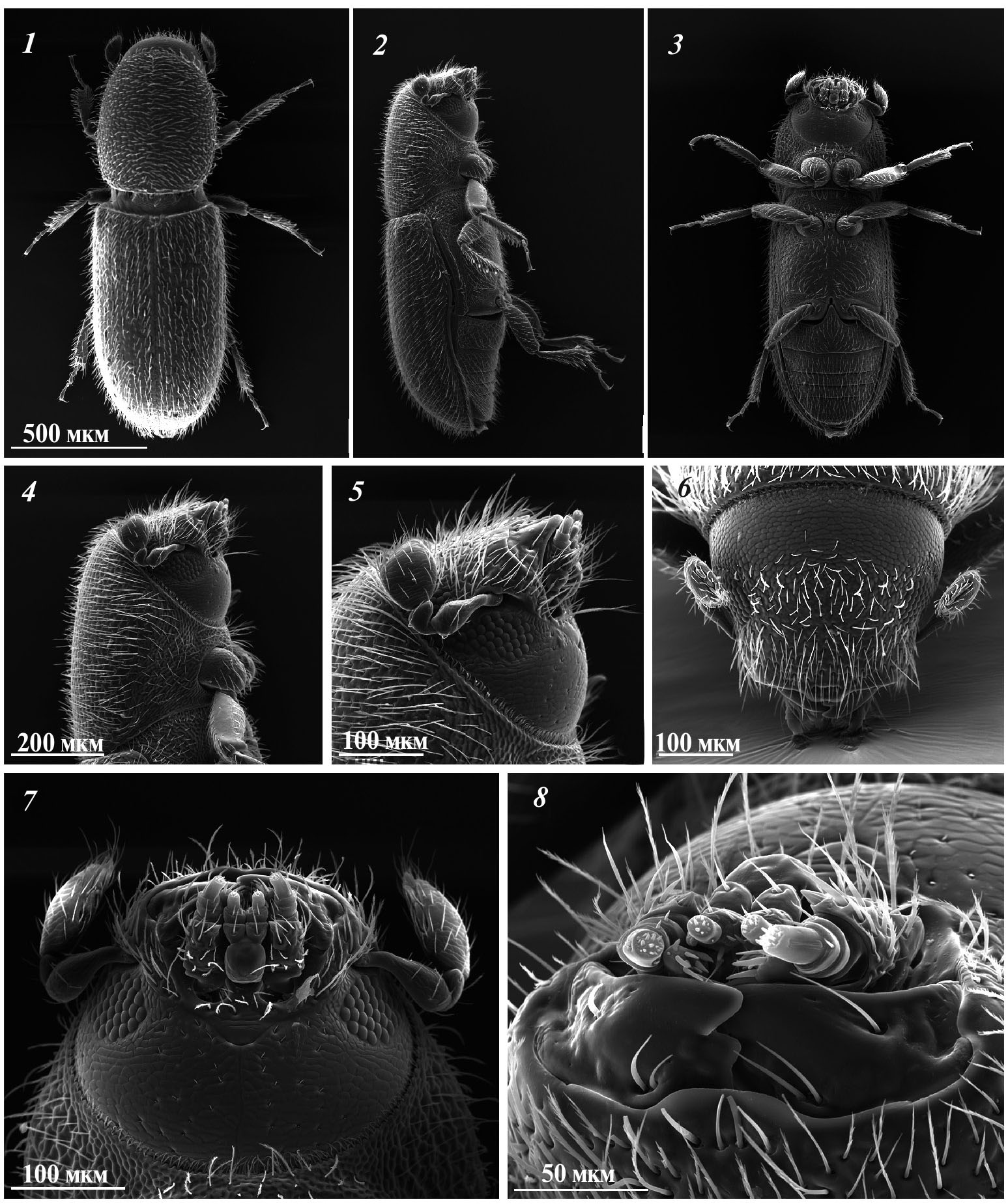 Рис. 2. Cisurgus ferulae Pfeffer, 30.89 км СЗ с. Егизкум. Фотографии со сканирующего электронного микроскопа. 1 ‒ вид сверху; 2 ‒ вид сбоку; 3 ‒ вид снизу; 4 ‒ переднегрудь и голова, вид сбоку; 5 ‒ голова, вид сбоку; 6 ‒ голова, вид сверху; 7 ‒ голова, вид снизу; 8 ‒ ротовой аппарат, вид снизу и спереди.