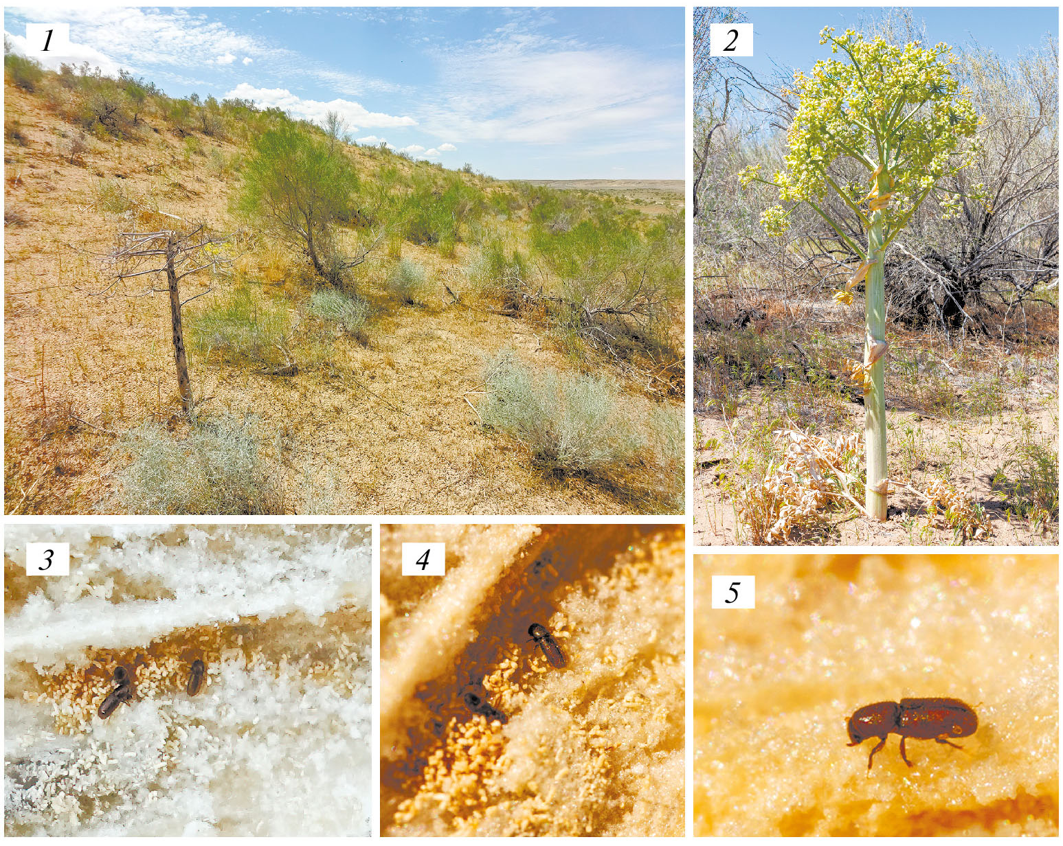 Рис. 3. Биотоп Cisurgus ferulae Pfeffer в Северном Казахстане (12.29 км Ю с. Аккудук). 1 – общий вид биотопа; 2 – кормовое растение Ferula foetida (Bunge) Regel с незрелыми семенами; 3, 4 – имаго внутри прошлогоднего стебля кормового растения с буровой мукой; 5 – имаго на тканях стебля кормового растения.
