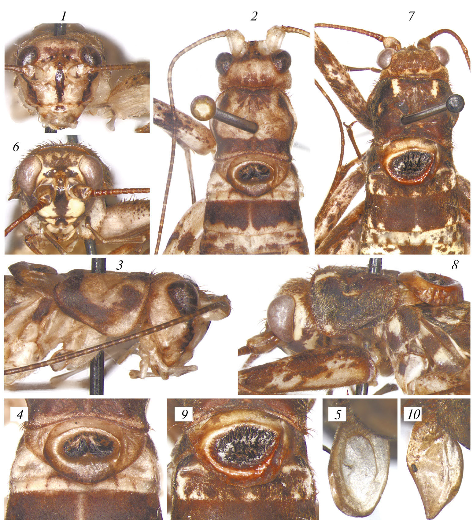 Рис. 1. Mikluchomaklaia spp., самец: голова спереди (1, 6), передняя половина тела сверху (2, 7) и сбоку (3, 8), надкрылья в покое сверху (4, 9) и левое надкрылье в приподнятом положении (5, 10). 1–5 – M. (Mikluchomaklaia) chupini sp. n. (1–4 – голотип, 5 – паратип); 6–10 – M. (M.) glupovi sp. n. (6–9 – голотип, 10 – паратип).