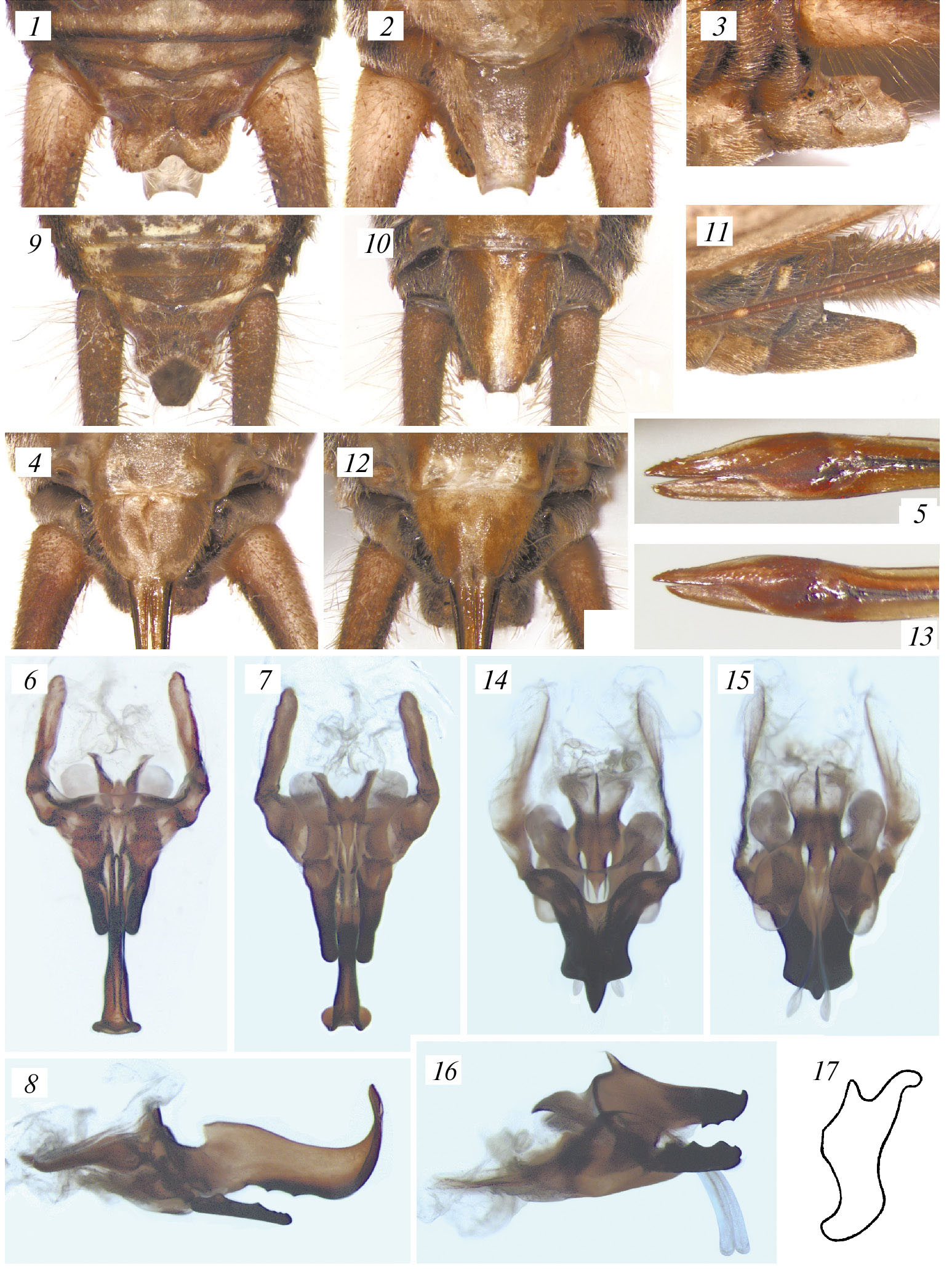 Рис. 2. Mikluchomaklaia spp., самец (1–3, 6–8, 9–11, 14–17) и самка (4, 5, 12, 13): анальная пластинка сверху (1, 9); генитальная пластинка снизу (2, 10) и сбоку (3, 11); вершинная часть яйцеклада сбоку (5, 13); гениталии сверху (6, 14), снизу (7, 15) и сбоку (8, 16); левый эктопарамер снизу (17). 1–8 – M. (Mikluchomaklaia) chupini sp. n. (1–3, 6–8 – голотип; 4, 5 – паратип); 9–17 – M. (M.) glupovi sp. n. (9–11, 14–17 – голотип; 12, 13 – паратип).
