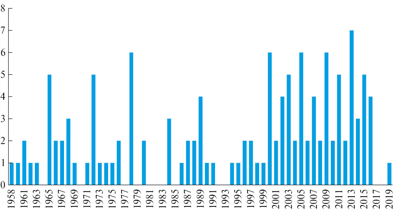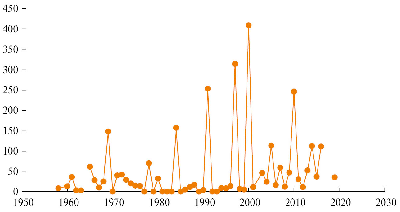 Рис. 3. Число публикаций Е. Б. Виноградовой по годам.