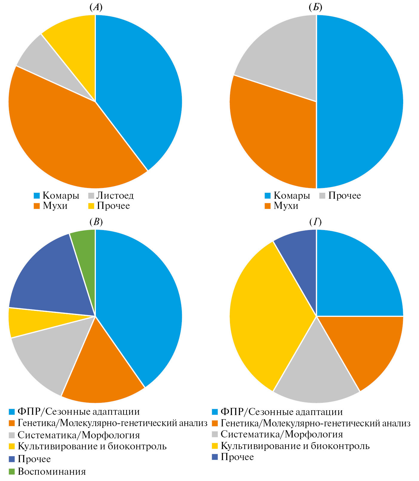 Нетрудно видеть, что наибольшее внимание Елена Борисовна уделяла исследованиям в направлении, заданном А. С. Данилевским, которое она продолжала развивать на протяжении всей своей научной деятельности. Сходным образом распределяются основные направления исследований и в монографиях Е. Б. Виноградовой с заметным перевесом комаров над мухами (5 : 3: рис. 4, В).