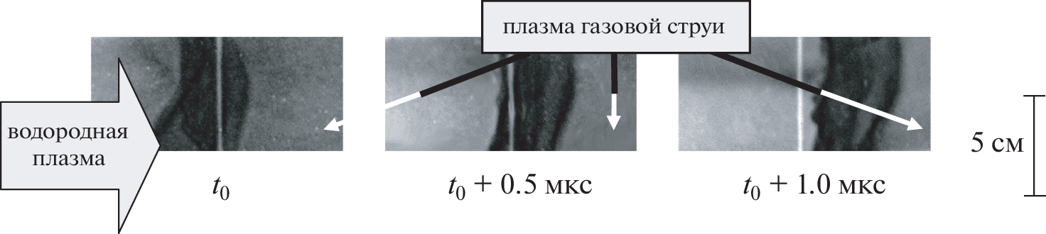 Представлены результаты исследований, направленных на создание компактного источника мягкого рентгеновского и вакуумного ультрафиолетового излучения при столкновении мощного плазменного потока с газовой струей. В проведенных экспериментах водородный плазменный поток с энергосодержанием ≈50 кДж и длительностью 10–15 мкс генерировался импульсным электродинамическим ускорителем. Поток с плотностью ≈6 × 1015 см–3 двигался со скоростью (2–4) × 107 см · с–1 в продольном магнитном поле с индукцией до 2 Тл и взаимодействовал с плоской сверхзвуковой газовой струей. Максимальная плотность газа, азота или неона, в струе достигала 1017 см–3. Продемонстрировано образование компактного излучающего слоя плазмы толщиной 3–5 см, двигающегося по ходу водородного плазменного потока со скоростью ≈3 × 106 см · с–1. В ряде экспериментов для локализации области взаимодействия плазменного потока и газовой струи в зоне, контролируемой диагностическими средствами, использовалась пластина вольфрама в качестве препятствия, ограничивающего смещение излучающей плазмы вдоль магнитного поля. С помощью мягкой рентгеновской обскурографии и спектроскопии получены данные относительно генерации излучения из зоны взаимодействия водородного плазменного потока и газовой струи. Приводятся результаты измерения энергии излучения из образующейся плазмы: ≈2 кДж в случае азотной струи и ≈3 кДж в случае неоновой. Численное моделирование линейчатого излучения многозарядных ионов и последующее сопоставление расчетных и экспериментальных данных позволило оценить электронную температуру азотной и неоновой плазмы, образующейся при взаимодействии водородного плазменного потока с газовой струей на уровне ≥40 эВ.