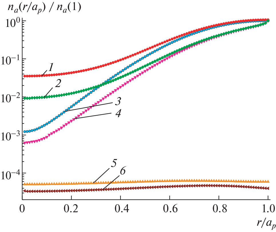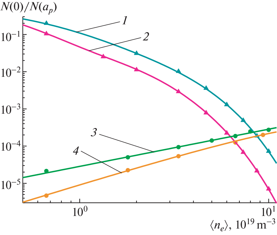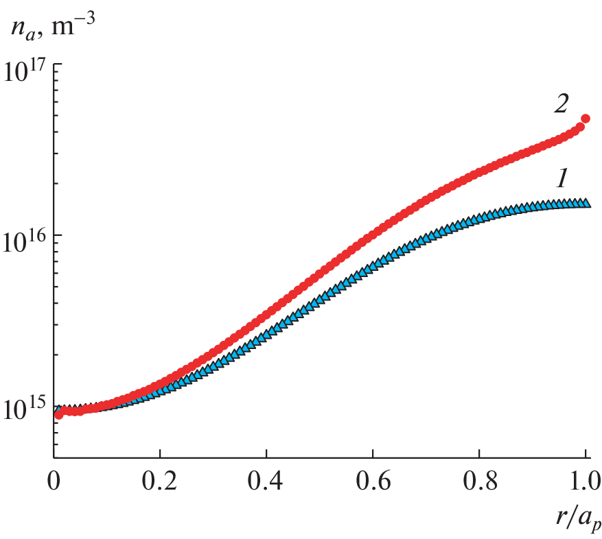 Выполнено 2D- и 3D-моделирование проникновения нейтральных частиц в плазму с параметрами, соответствующими режиму омического нагрева в стеллараторе Л-2М, и проведено сравнение результатов моделирования. Получены радиальные распределения плотности нейтралов в плазменном шнуре и модельные энергетические спектры потока атомов перезарядки, вылетающих из плазмы. Для условий омического нагрева в стеллараторе Л-2М определены значения плотностей плазмы, выше которых необходимо учитывать при моделировании процессы рекомбинации. Сравнение модельных энергетических спектров потока атомов перезарядки, вылетающих из плазмы, с экспериментальными данными позволило построить радиальные распределения плотности нейтралов в абсолютных единицах. При этом расчетное значение плотности нейтралов в центре плазменного шнура составило около 1015 м–3, что на четыре порядка меньше плотности заряженных частиц 1019 м–3.
