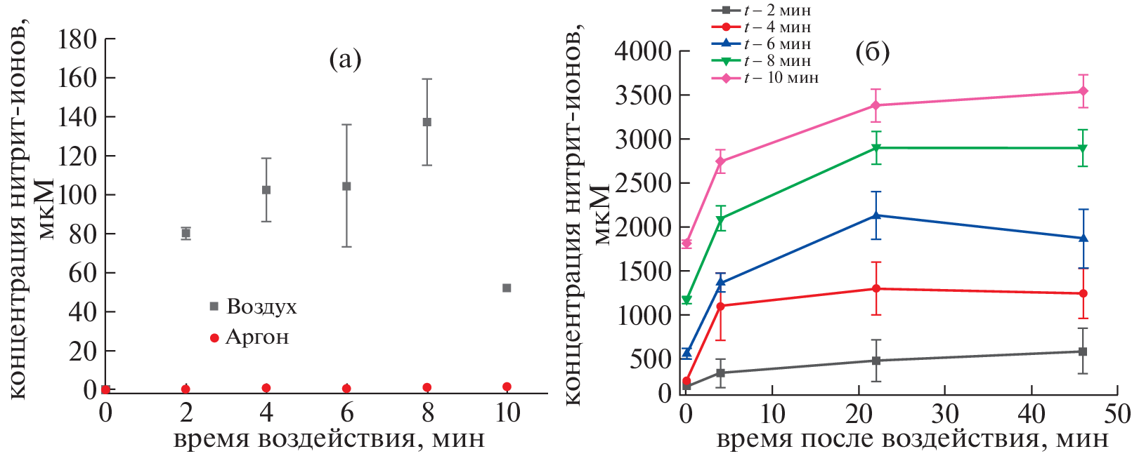 Представлены результаты исследований образования активных форм кислорода и азота в деионизированной воде Milli-Q® (электрическая проводимость ≤0.1 мкСм/см) под действием многоискрового импульсного разряда с инжекцией газа в межэлектродное пространство. Разряд представляет собой совокупность микроплазменных образований в многофазной среде, для которых был оценен удельный энерговклад. Проанализировано влияние инжектируемых газов (аргон, воздух) на образование плазменного разряда в межэлектродном пространстве и долгоживущих химических соединений: пероксида водорода, нитрит-ионов и нитрат-ионов. Изменение длительности воздействия на воду от 2 до 10 минут приводит к изменению ее химического состава и электропроводящих свойств, но практически не сказывается на характеристиках и длительности пробойной стадии разряда. При этом регистрировалось изменение концентраций пероксида водорода, нитрит-ионов и нитрат-ионов в течение одного часа после завершения плазменного воздействия. Обнаружено распыление электродов из нержавеющей стали, которое составило около 1 мг/минуту и приводило в ряде случаев к выпадению нерастворимого осадка. Полученные данные позволят провести оптимизацию воздействия активированной плазмой жидкости на растения и посадочный материал.