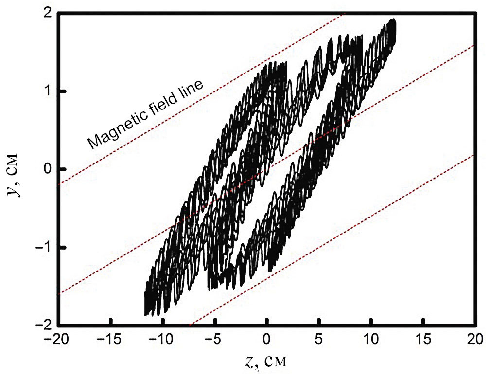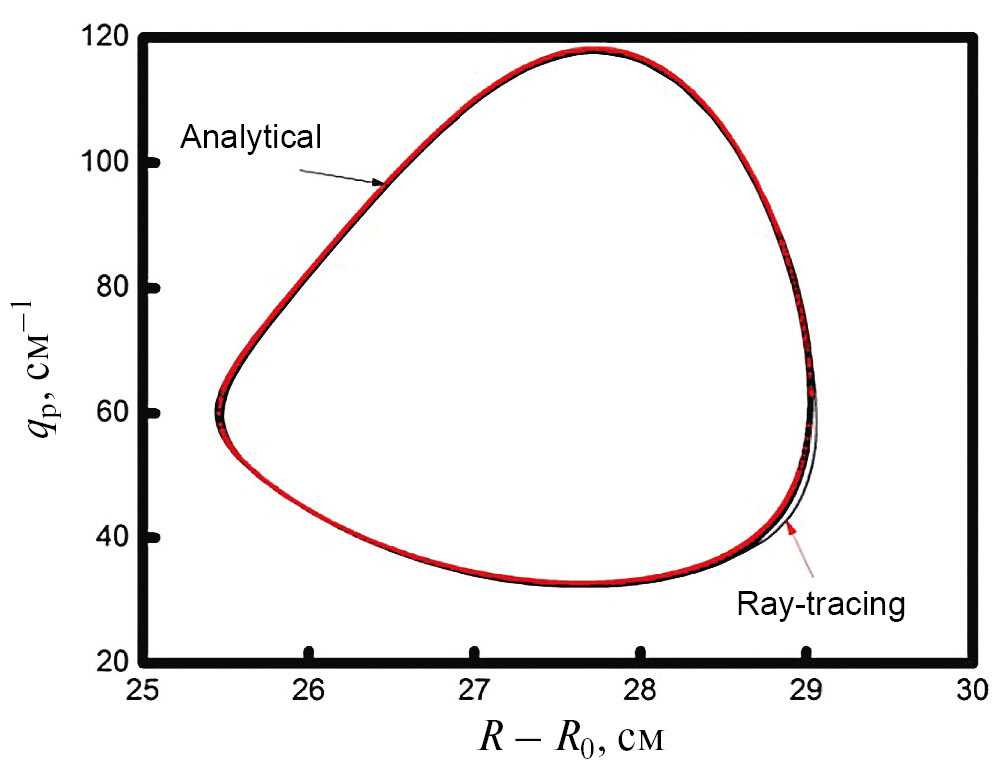 На рис. 2 показана траектория той же верхней гибридной волны в плоскости магнитной поверхности токамака TEXTOR [29]. Магнитные силовые линии здесь изображены пунктирными линиями. Видно, что траектория ВГ-волны оказывается двумерно локализованной – вдоль потоковой переменной в окрестности локального максимума плотности; вдоль поперечного направления на магнитной поверхности, как результат двумерной неоднородности профиля плотности в магнитном острове и неоднородности магнитного поля, которые являются факторами, действующими в тандеме.