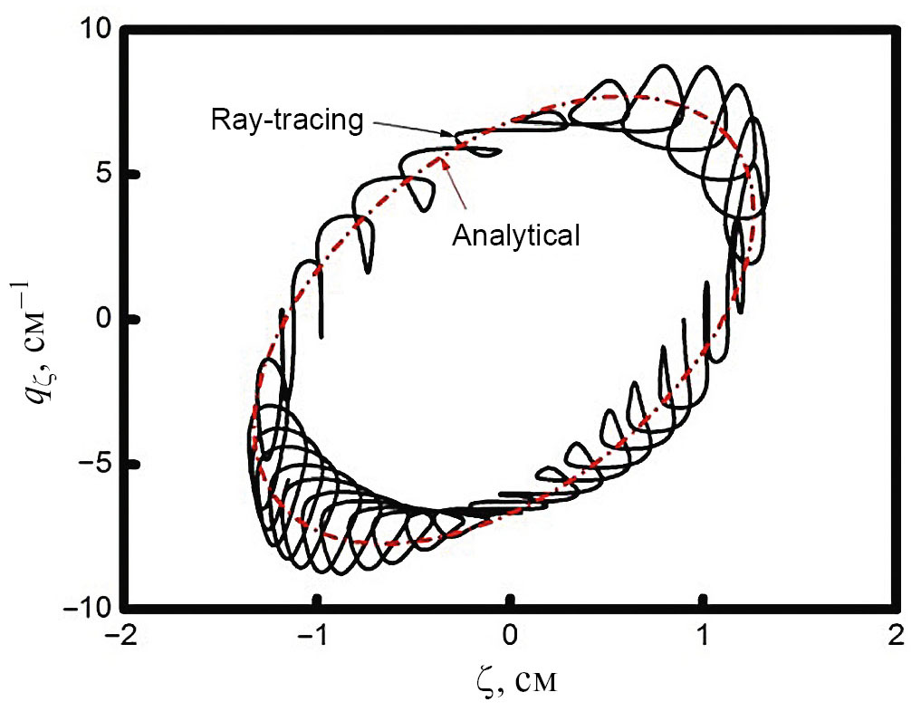 На рис. 4 показана компонента волнового вектора qζ(ζ), полученная численно в результате трассировки лучей и указанная стрелкой. Аналитическое решение (5) показано пунктирной кривой и указано стрелкой. Видно, что аналитическое решение показывает усредненное значение численного решения, поскольку зависимость коэффициентов от быстрого движения по координате х усреднена на первом шаге процедуры разделения временны́х масштабов.