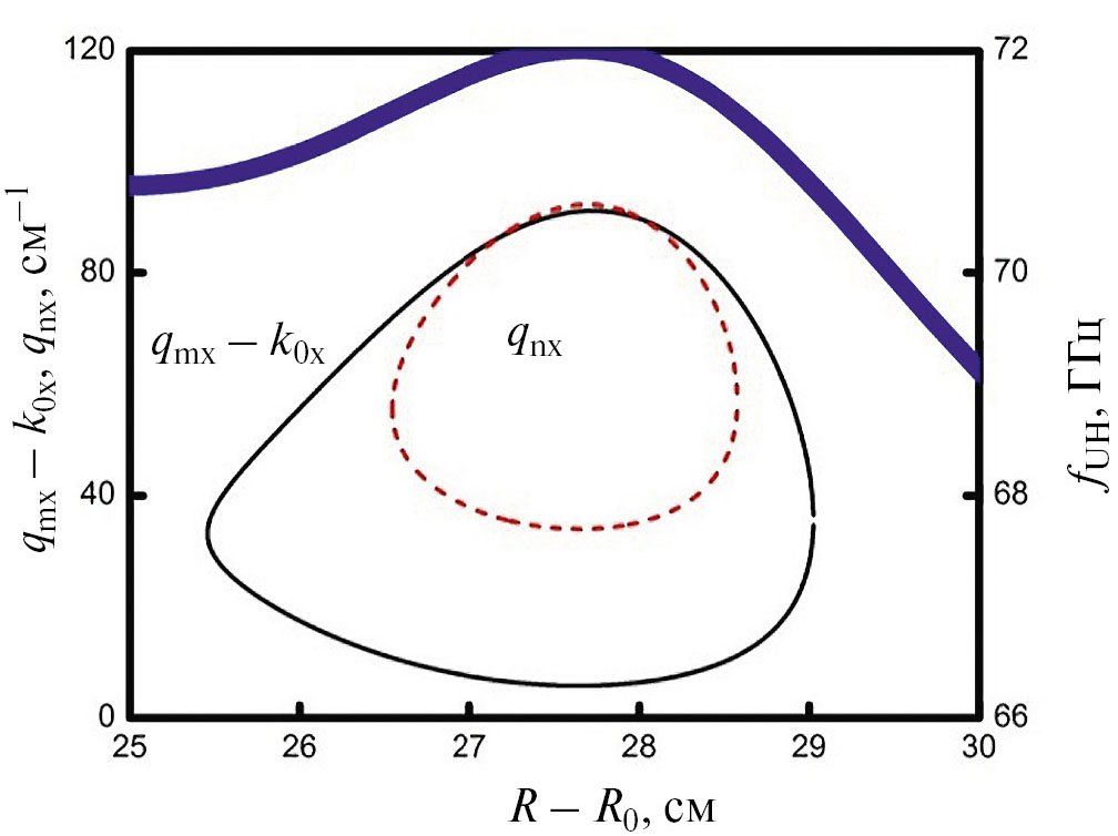 На рис. 5 показано волновое число первой ВГ-волны fm = 69.71 ГГц, , m = (40,3), сдвинутое вниз на величину волнового числа необыкновенной волны накачки, показано сплошной линией. Волновое число второй ВГ-волны – пунктирная линия. Профиль ВГ-частоты изображен толстой сплошной кривой.