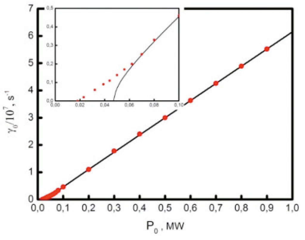 На рис. 8 показана зависимость инкремента первичной неустойчивости от мощности накачки. Сплошная линия показывает аналитическую зависимость (16). Символы – результат численного решения уравнений (13).