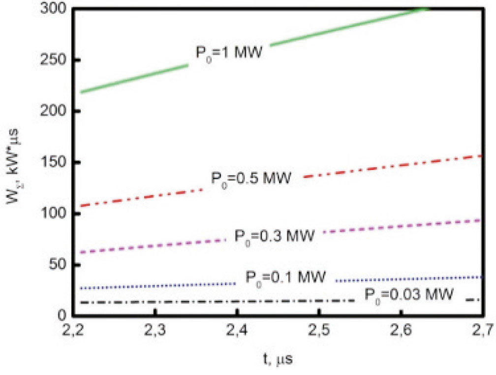 Чтобы оценить уровень аномального поглощения, найдем численно энергию всех ВГ-волн во всей области расчета, т.е. , а затем вычислим ее производную по времени . Рисунок 9 показывает зависимость энергии всех ВГ-волн от времени, в пределах области расчета WS в режиме насыщения для различной мощности накачки. Наблюдается линейная зависимость WS от времени.