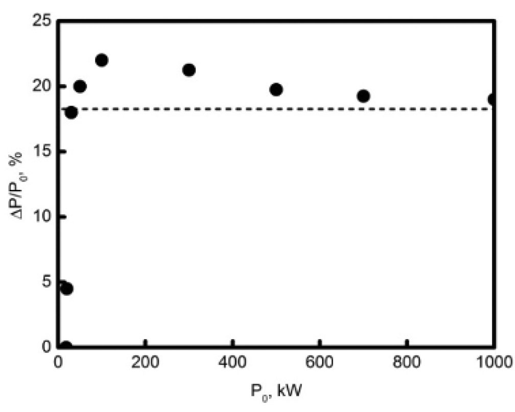 Рисунок 10 показывает зависимость уровня аномального поглощения от мощности накачки. Символы показывают результат численного решения . Сплошная линия дает аналитическую зависимость. Для мощности накачки 0.4–0.8 МВт, которая обычно использовалась в ЭЦРН-экспериментах на токамаке TEXTOR, аномальное поглощение достигает 20% и оказывается примерно в пять раз больше, чем в случае, когда обе первичные ВГ-волны могли испытывать нечетное число вторичных неустойчивостей [20]. Подчеркнем, что оно, тем не менее, существенно (в четыре раза) меньше, чем аномальное поглощение в случае, когда в обоих каналах число вторичных распадов оказывается четным [20].