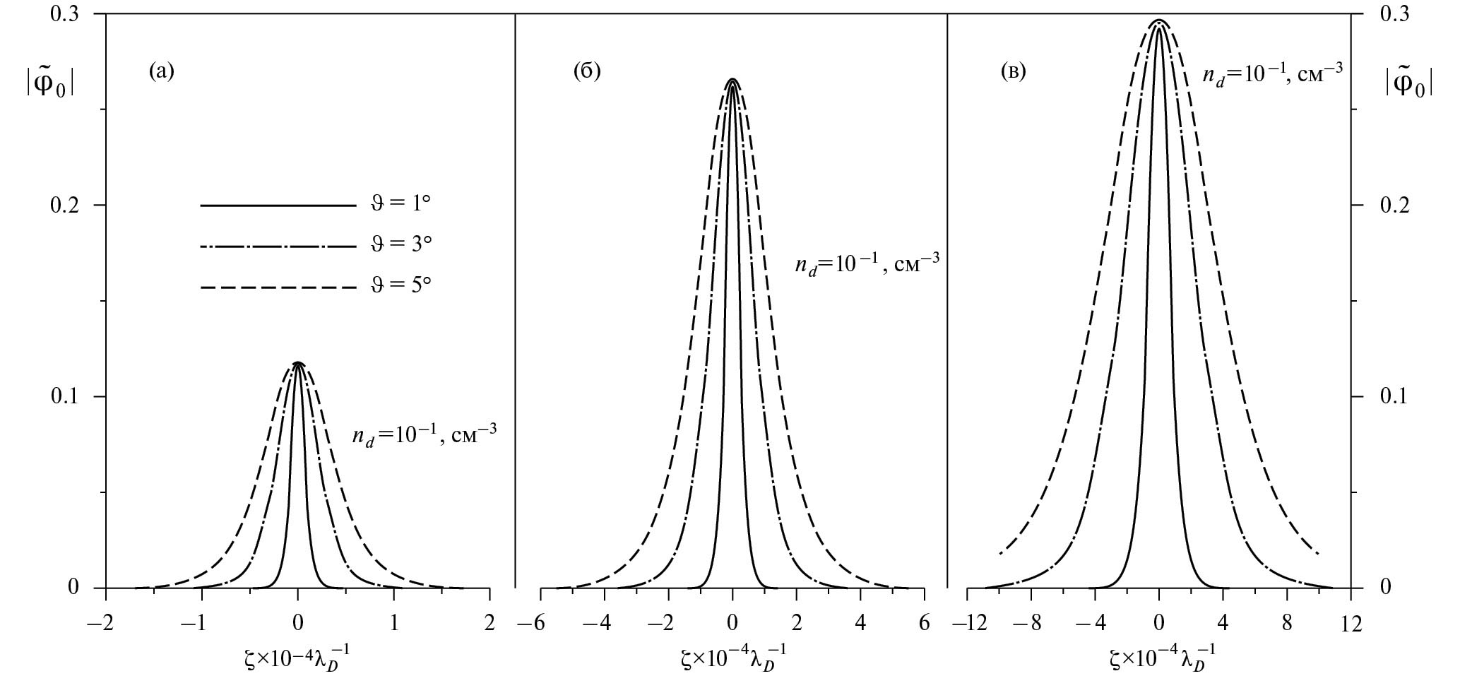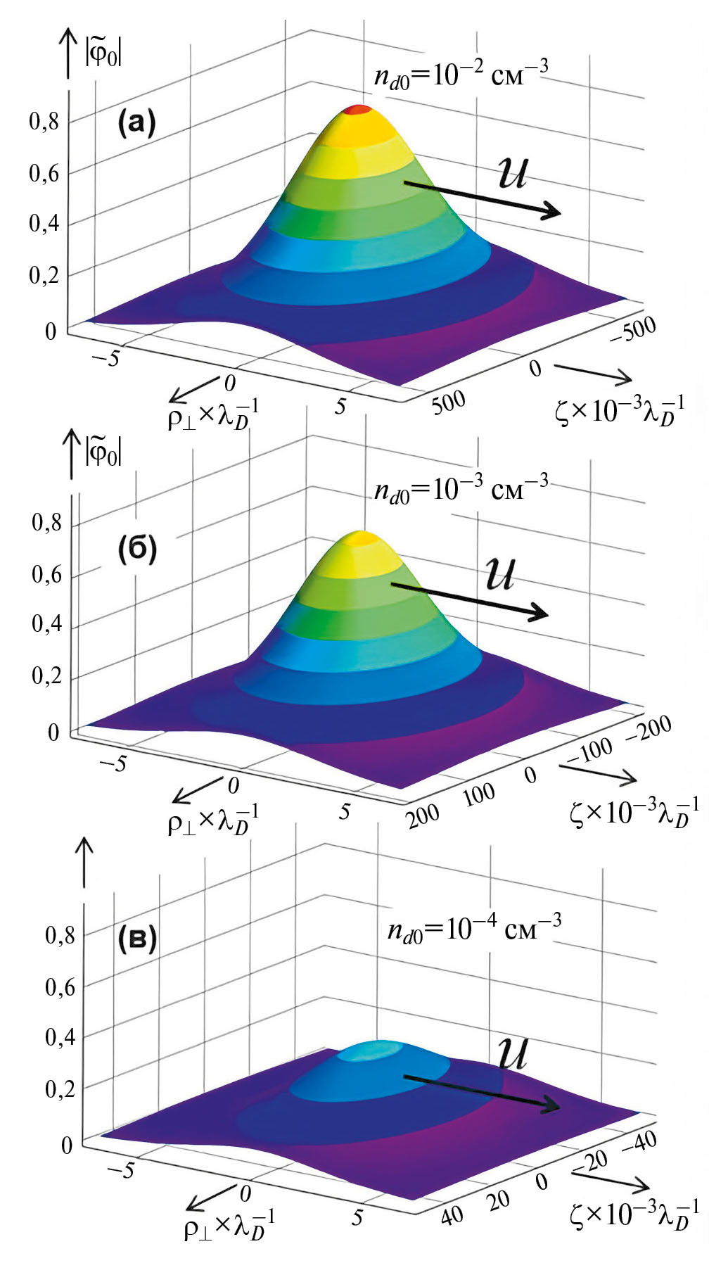 Это уравнение допускает численное решение в виде сферически симметричного солитона. Такое решение приведено на рис. 3 для трех ситуаций, соответствующих различным значениям концентрации пыли: nd0 = 10–2 см–3 (рис. 3а), nd0 = 10–3 см–3 (рис. 3б), nd0 = 10–4 см–3 (рис. 3в).