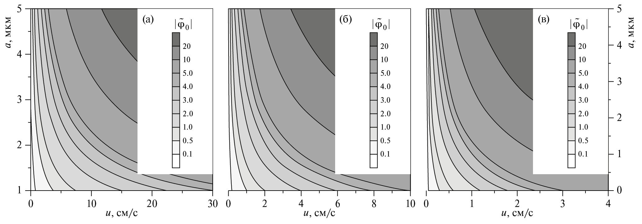 Рис. 2. Модули амплитуд солитонных решений (67) в зависимости от характерных средних размеров пылевых частиц a и скорости распространения солитона u при = 5° для nd0 = 10–4 см–3 (а), nd0 = 10–3 см–3 (б), nd0 = 10–2 см–3 (в)