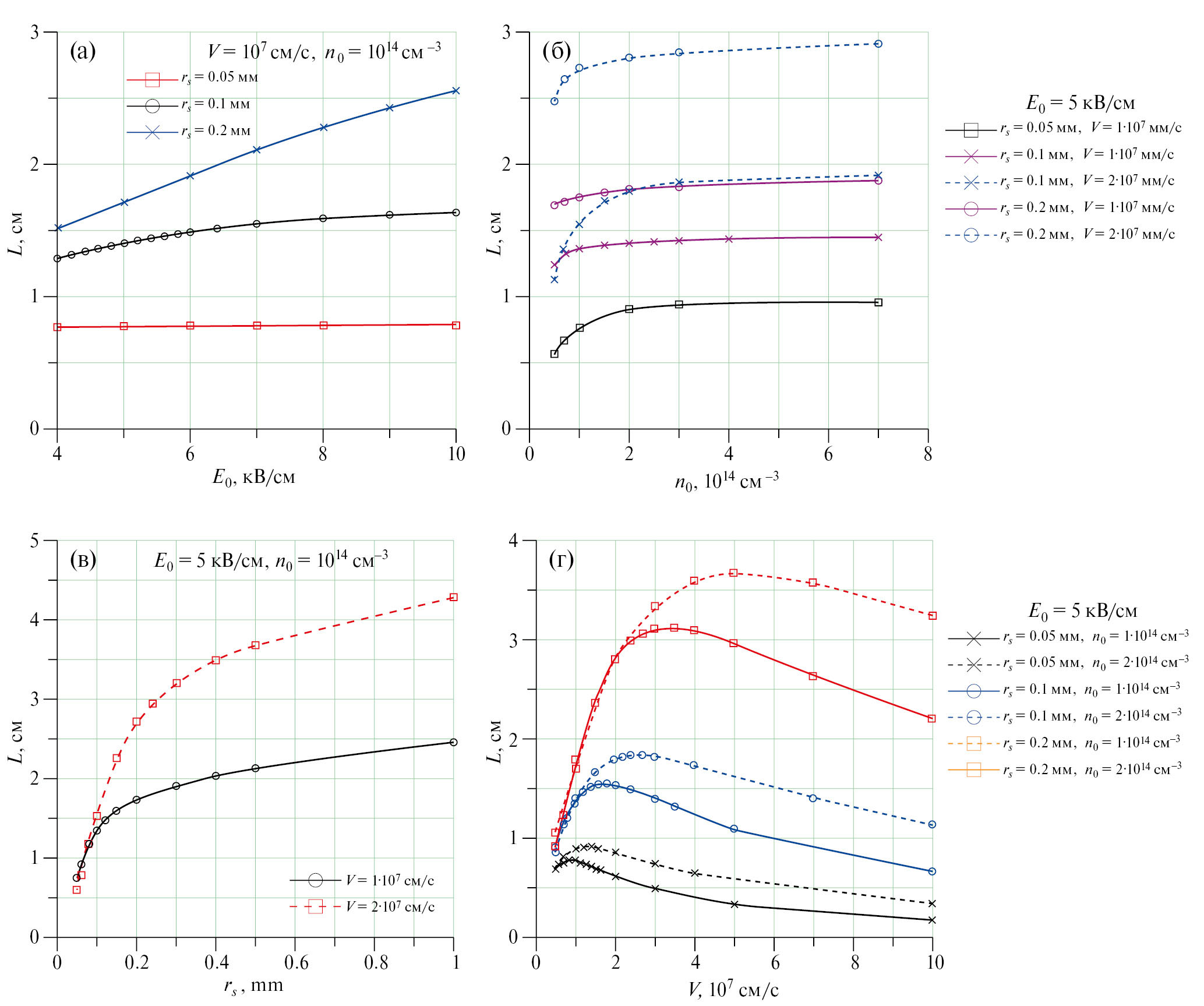 Данные о скорости критического стримера (минимальной скорости положительного стримера) тоже в разных экспериментах довольно сильно разнятся — например, в работе [20] эта скорость равна 2 ∙ 107 см/с. Величину ошибки определения эквипотенциальной длины, связанную с неопределенностью входных параметров стримера, можно оценить по рис. 5. Эта ошибка нигде не превышает коэффициента