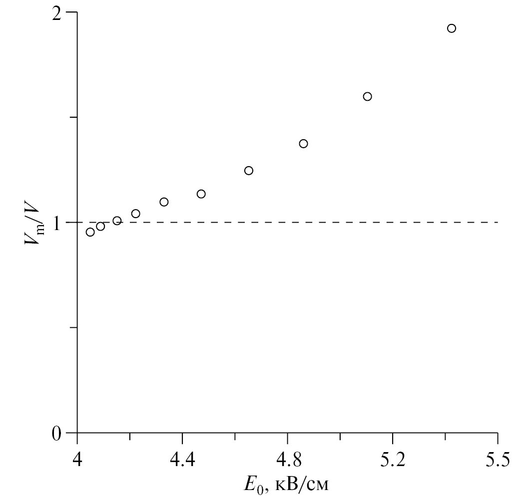 при постоянных значениях E0, rs и n0, формально примененный к стационарным стримерам, дает значения скорости стримера Vm, показанные на рис. 6 в отношении к скорости V для разных значений E0. Минимальное значение стабилизирующего поля (E0 = 4.05 кВ/см), найденное в работе [3], должно быть близким к критическому полю. Соответственно, и другие параметры этого квазистационарного стримера должны быть близки к параметрам критического стримера. Критерий ∂L(V)/∂V = 0 должен выполняться только для критического стримера. Из рис. 6 видно, что по мере уменьшения стабилизирующего поля E0 и приближении его к критическому полю отношение Vm/V также приближается к единице.