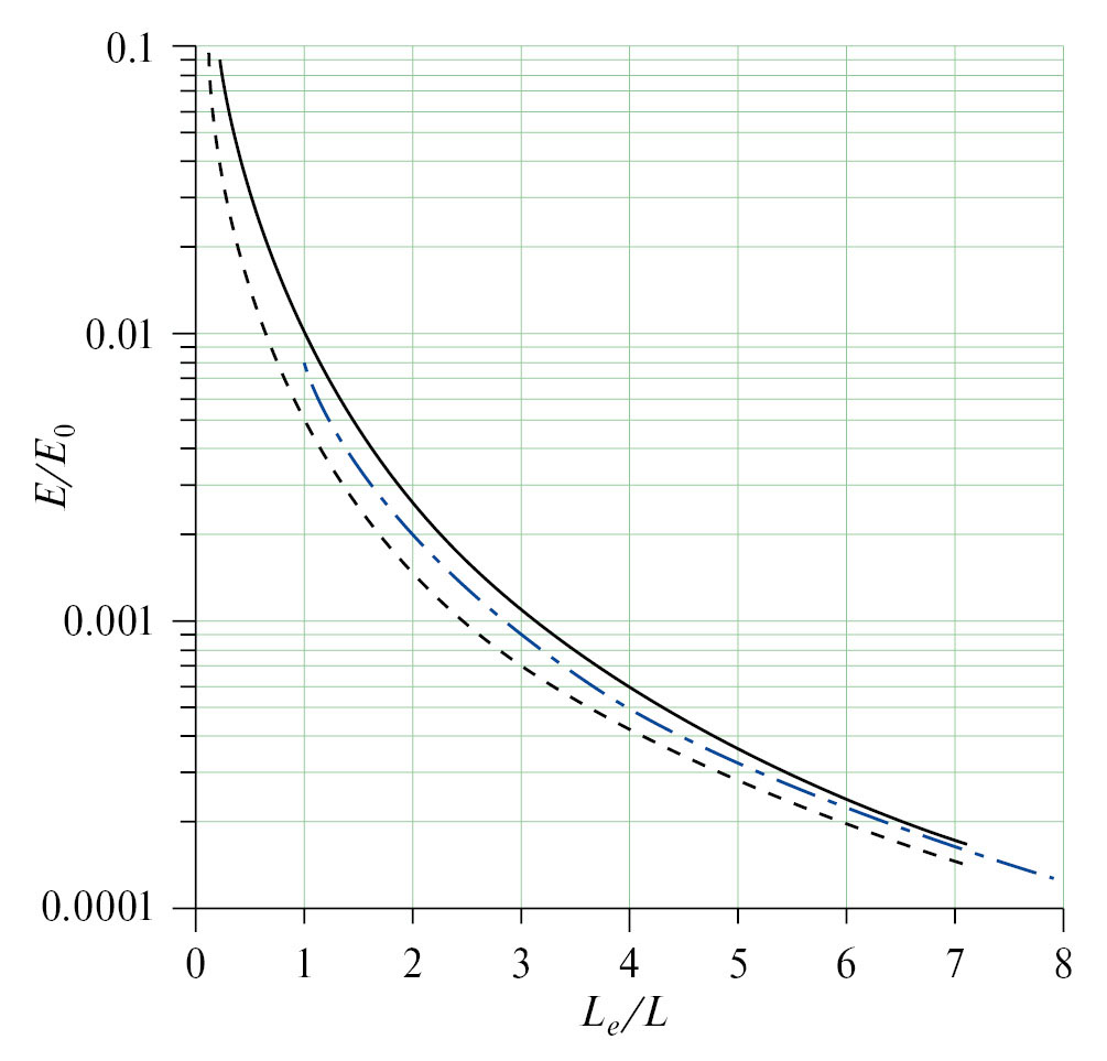 Рис. 8. Относительное возмущение поля вблизи головки стримера, вызываемое изображением заряда стримера в плоских электродах, в зависимости от отношения расстояния от головки стримера до соответствующего электрода к эквипотенциальной длине стримера. Сплошная линия относится к электроду, от которого стример удаляется; пунктирная — к электроду, к которому стример приближается; штрихпунктирная — это функция 0.008(L/Le)2