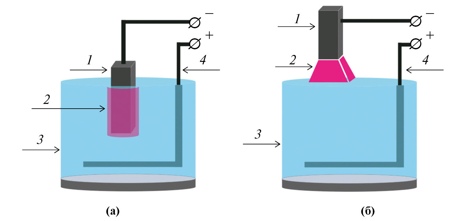 Зажигание и исследование электрического разряда в рассматриваемой конфигурации электродов осуществлялось на установке (рис. 1), где 1 – металлический катод; 2 – область с разрядом; 3 – электролитическая ванна; 4 – металлическая пластина из меди марки М1 для подвода положительного потенциала к электролиту. В качестве металлического катода применялся металлический стержень из алюминия марки АМЦ-40, а в качестве жидкого неметаллического анода использовался 3%-ный раствор хлорида натрия (NaCl) в очищенной водопроводной воде.