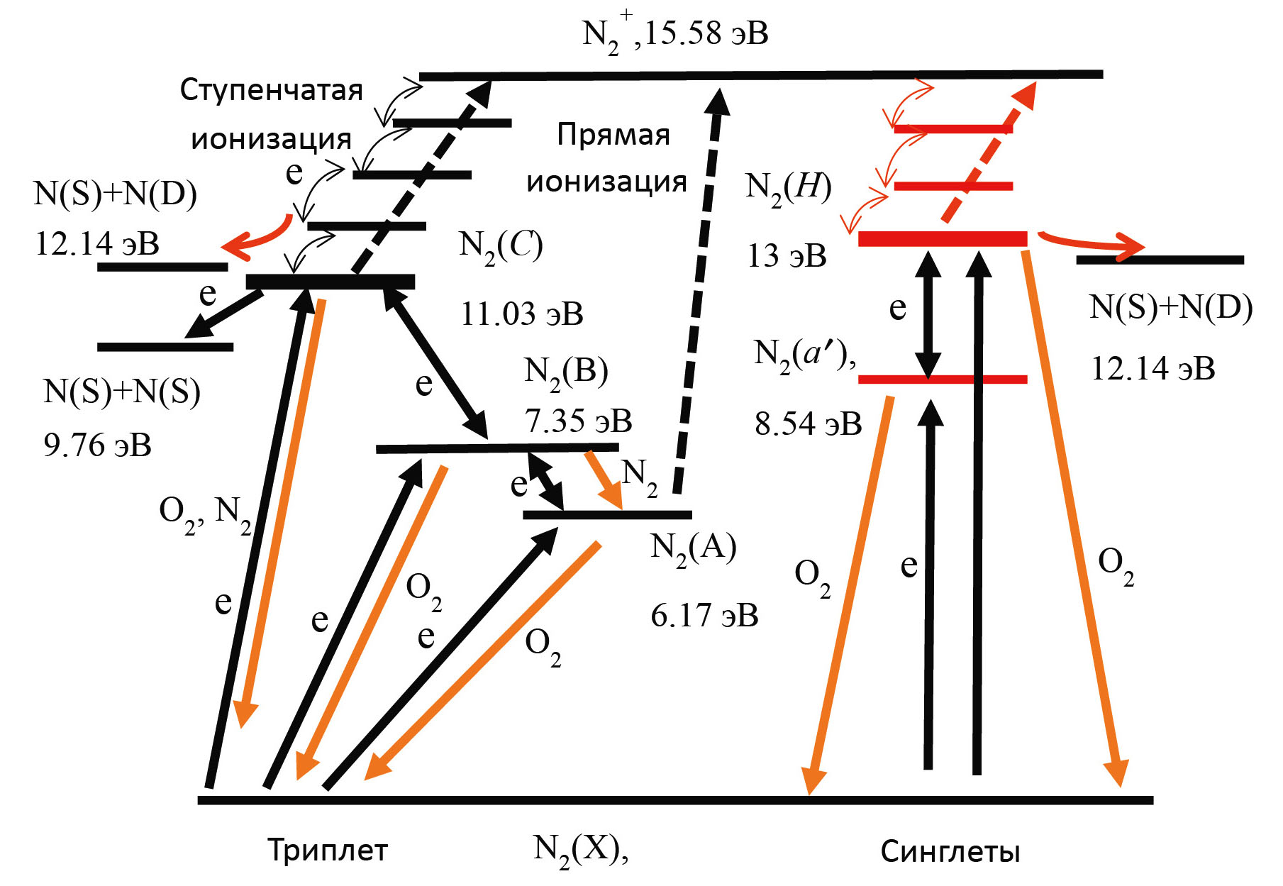 Переходы между возбужденными состояниями молекулы N2 под действием электронного удара проходят преимущественно между состояниями одной мультиплетности, т.е. в азоте “работают” два канала — по триплетным (A, B и C) и синглетным (а′ и Н) термам.