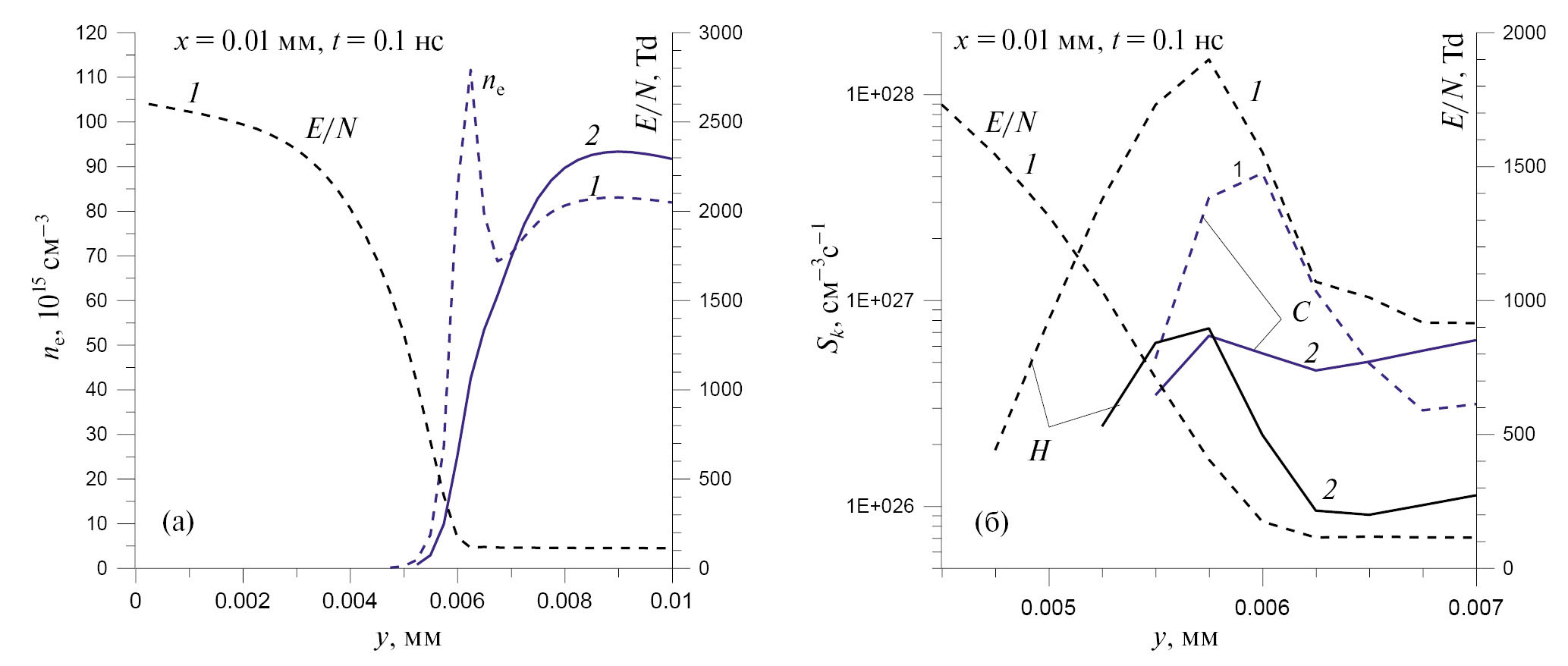 Рис. 3. Профили ne, E/N (а) и скоростей процессов возбуждения Н и С состояний (б) в сечении разряда x = 0.01мм в N2 при V = +40 кВ, N/N0 = 4 без коррекции (1) и с коррекцией (2) констант скорости возбуждения Н- и С-состояний
