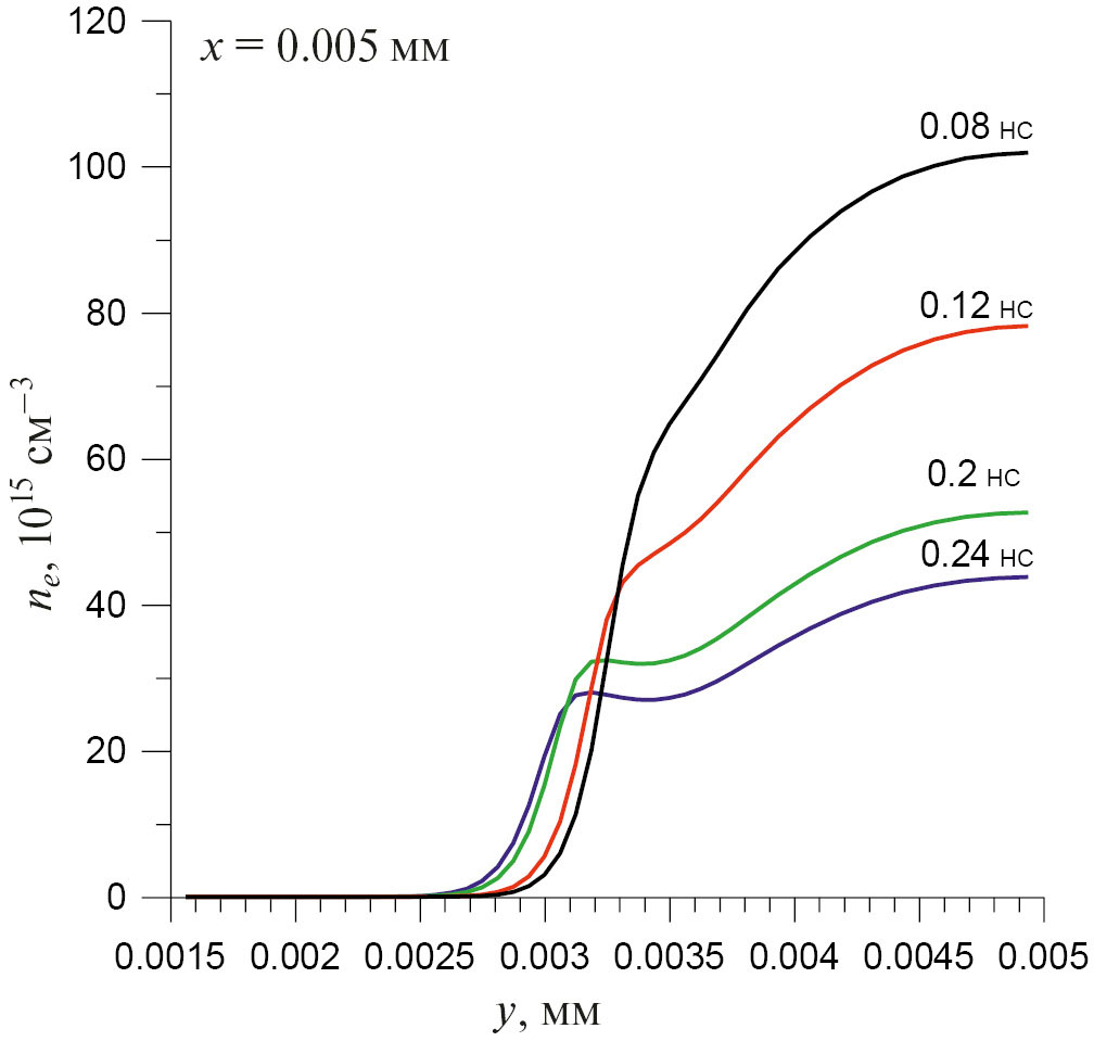 Рис. 6. Эволюция профиля ne в сечении разряда х = 0.005 мм; воздух, V = +40 кВ, N/N0 = 8