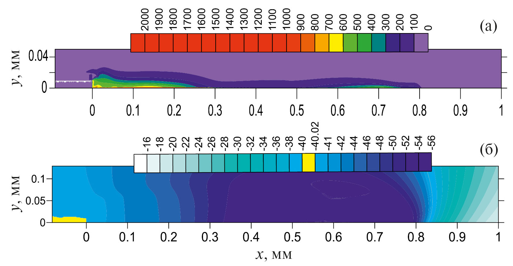 Рис. 9. Пространственные распределения ne в ед. 1015 см–3 (a) и потенциала в ед. кВ (б) в азоте в момент времени 0.06 нс; V = –40 кВ, N/N0 = 6